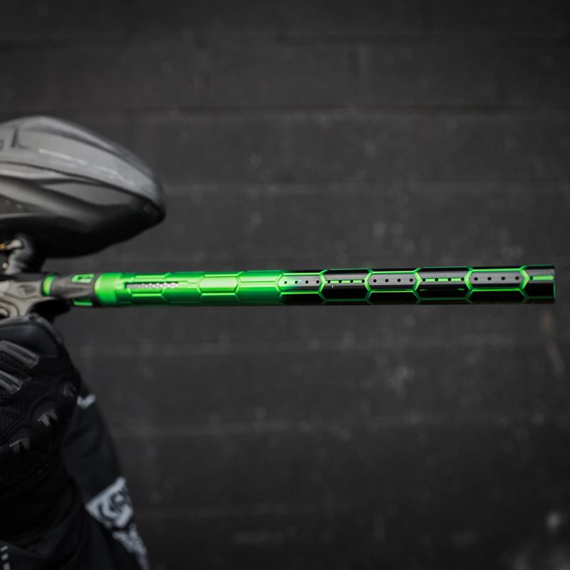 Featuring exterior custom milling and precision-honed barrel tip, the "Nexus" LAZR Elite Barrel Kit makes a stellar enhancement to your marker aesthetic while delivering ball-on-ball accuracy with reduced sound signature. With 8 bore inserts to choose from, simply size your paintballs with the included bore sizer and slide the perfectly matched bore insert into the barrel back.