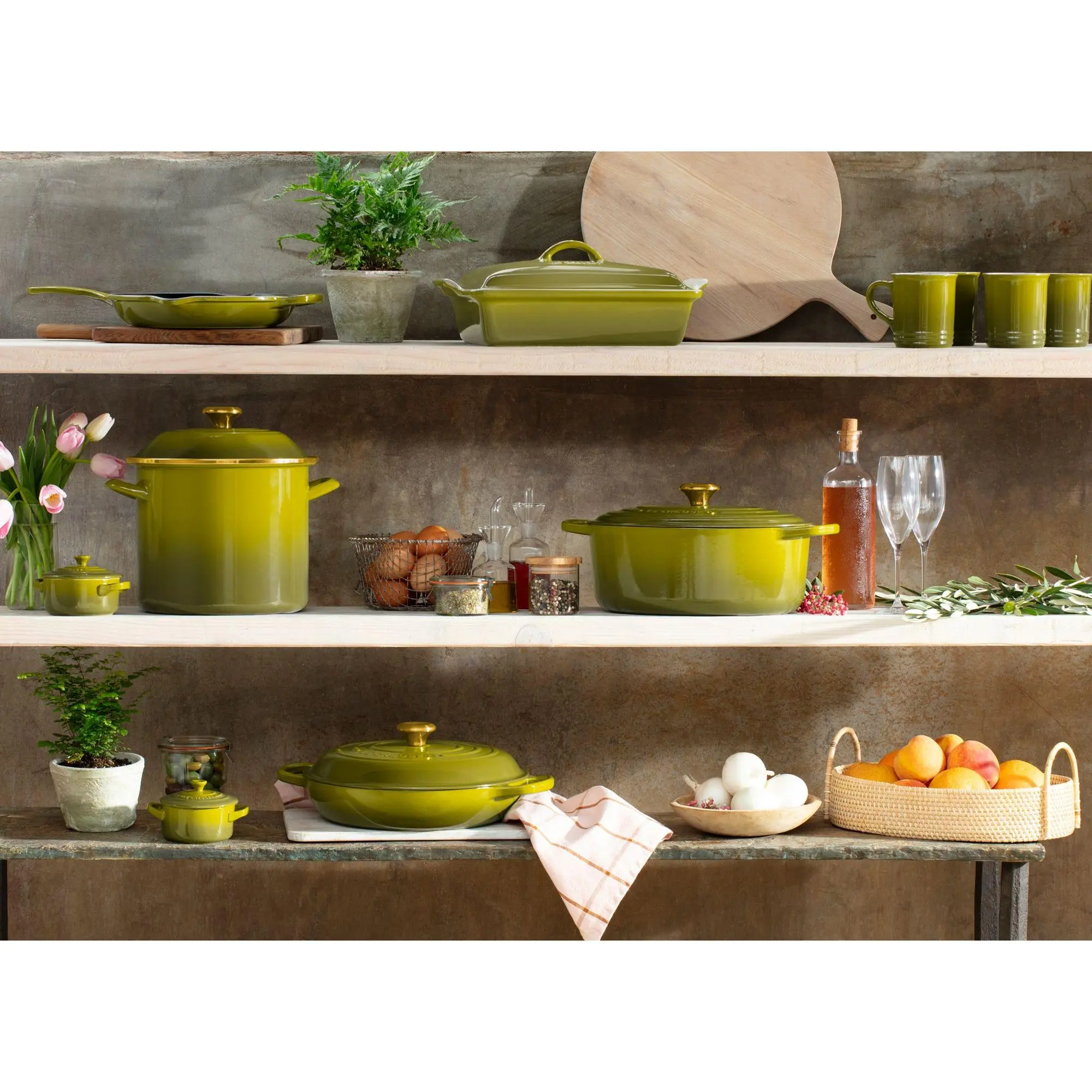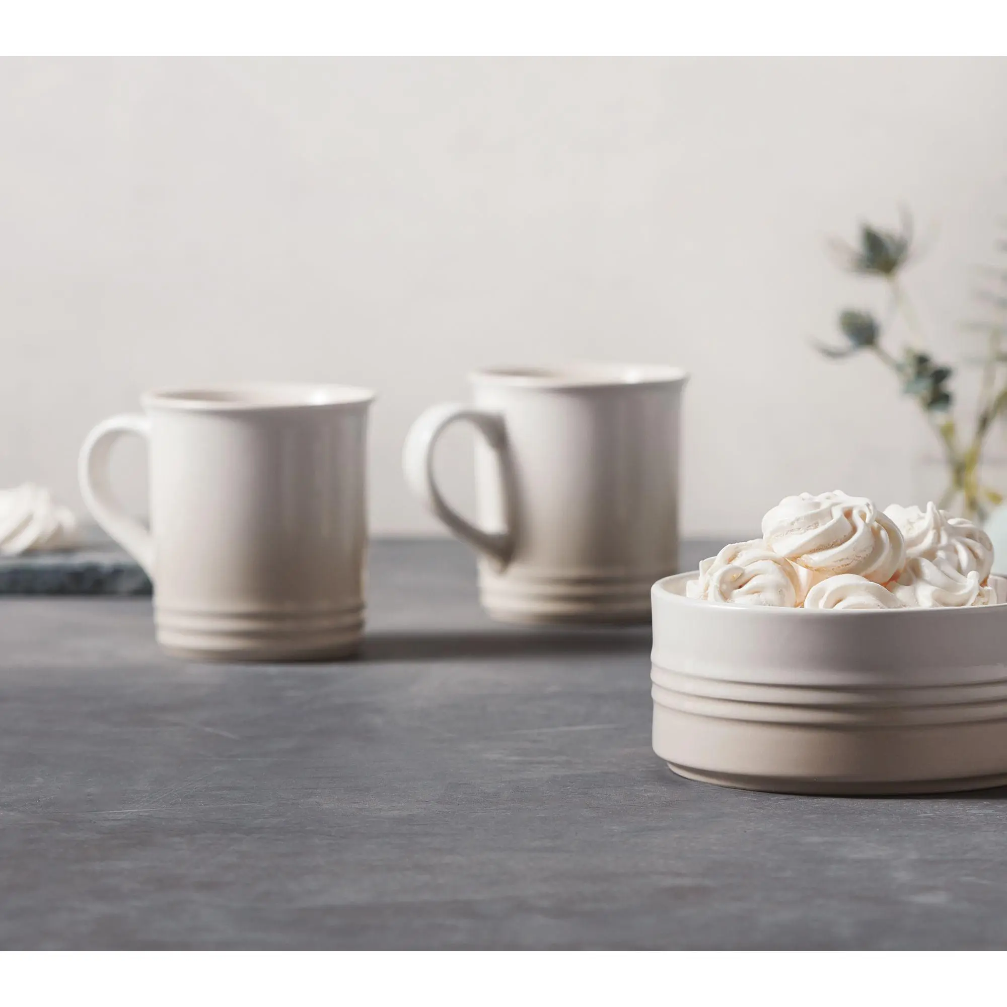 How do you take your coffee? Whether you add cream and sugar or drink it black, you'll sip in style from this 12-oz coffee mug's universally palate-pleasing color palette. The durable, enamel-coated exterior with a signature three-ring accent makes your morning cup o' joe into an art form. From Le Creuset.