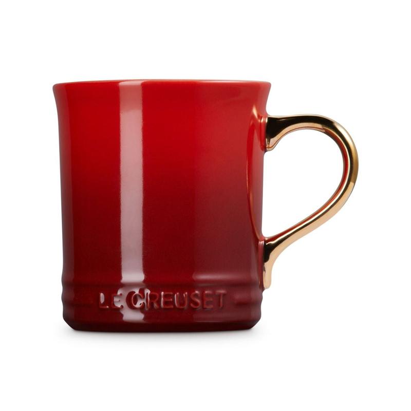 Welcome a luxe look to your daily drinkware with the Le Creuset 14oz Gold Metallic Handle Mug. Perfectly sized for enjoying all your favorite hot beverages, this mug is the ideal way to enjoy a robust morning brew or relaxing chamomile tea at bedtime. Le Creuset's world-renowned stoneware ensures that this mug will retain heat longer. The glaze is resistant to scratches and stains and is non-porous to prevent flavor and odor absorption. Backed up by a 10-year warranty, this mug is guaranteed to resist cracking and crazing for years of satisfactory use. Le Creuset's bold and lustrous Cerise Red will make a statement in your kitchen and catch the eye of any guest served, so don't hesitate to order your Le Creuset Gold-Handle 14oz Mug in Cerise today.