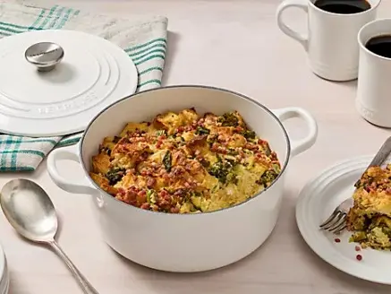 Simmer up hearty soups or stews and bring braised pot roasts to the table (classic colors and new hues make a bright centerpiece). Serve a side of rich risotto and deep fry a funnel cake for dessert (yep, we went there). Crafted by French artisans, this multi-tasking meal maker really does it all. The durable enameled cast-iron design features a light-colored interior that resists stains and helps provide even heat distribution to avoid hot spots that can burn your food. And easy release makes searing, serving, and cleanup a breeze.