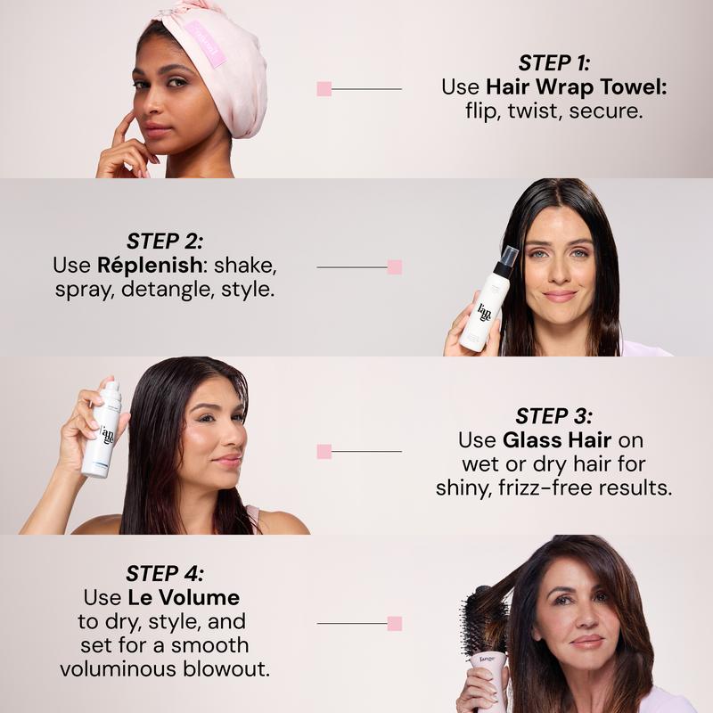 Le Volume combines a hair dryer with a style-sculpting thermal brush, making it perfect to create a salon-worthy blowout. Start by wrapping hair in the absorbent Hair Wrap Towel to cut drying time. Spritz Réplenish Conditioning Spray to detangle and help brushes glide through with ease. Then, prep damp strands with Glass Hair that doubles as a thermal protectant and frizz fighting treatment for a mirror-like finish. Once your hair is approximately 70% dry, give your mane the smoothest, glossy blowout using Le Volume.
