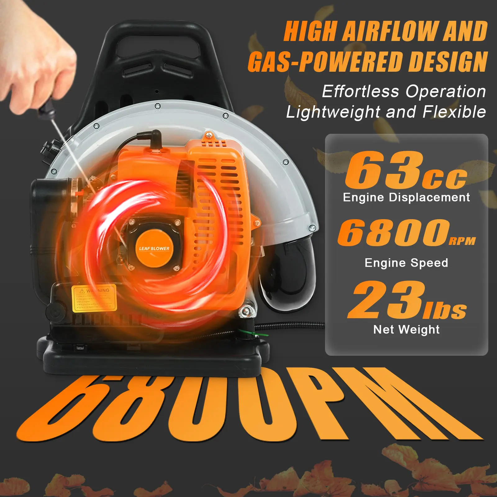 ·Impressive Efficiency & Large Fuel Tank: Its large displacement of 63CC provides a high speed of 6800r/min. Its powerful two-stroke engine (2.7kW) can quickly remove leaves, sand, hard gravel, and snow, improving your work efficiency.The 0.47 gal large fuel tank allows you to use the machine for a long time without the hassle of repeatedly adding fuel. The oil bubble and visible fuel delivery pipe also facilitate the process of refueling.