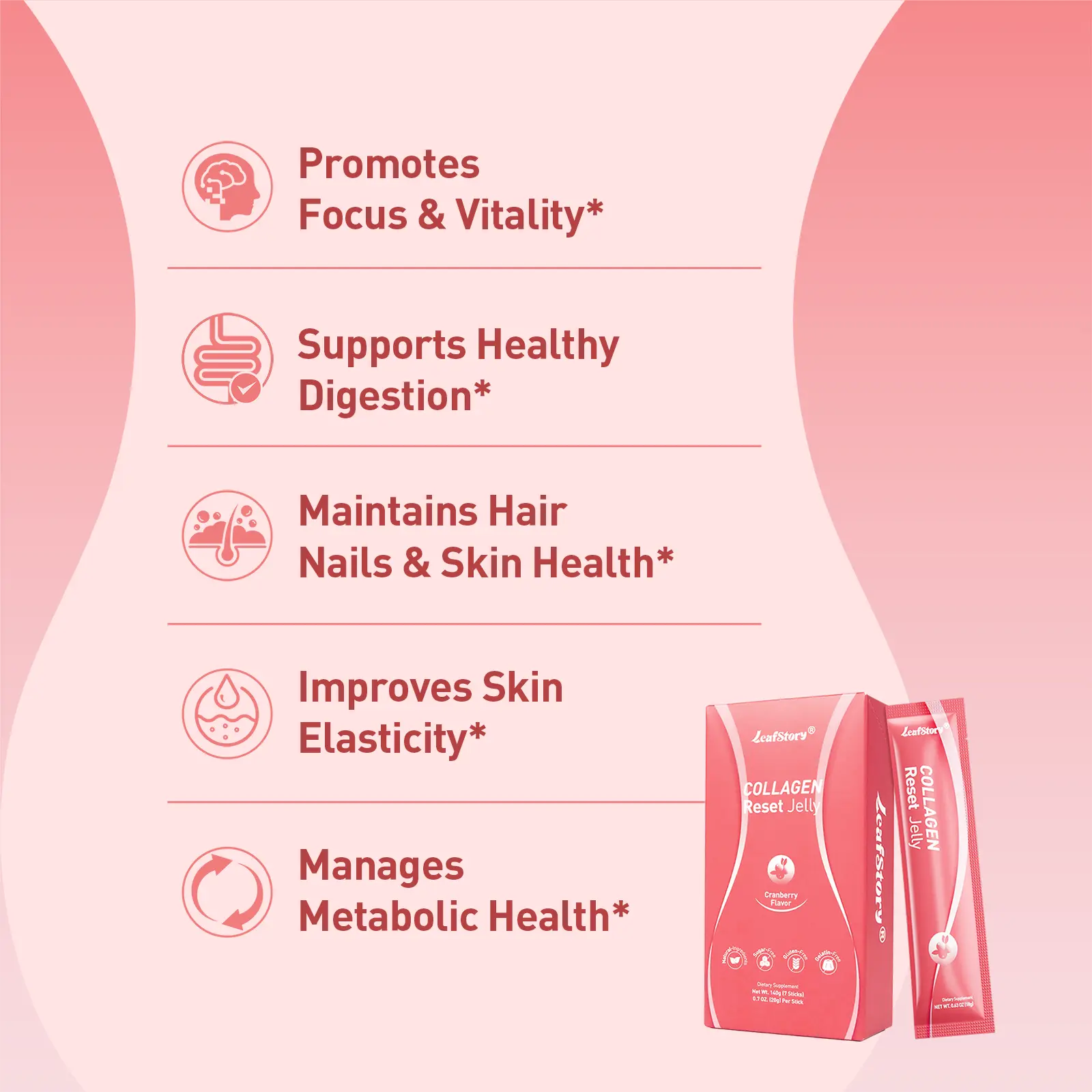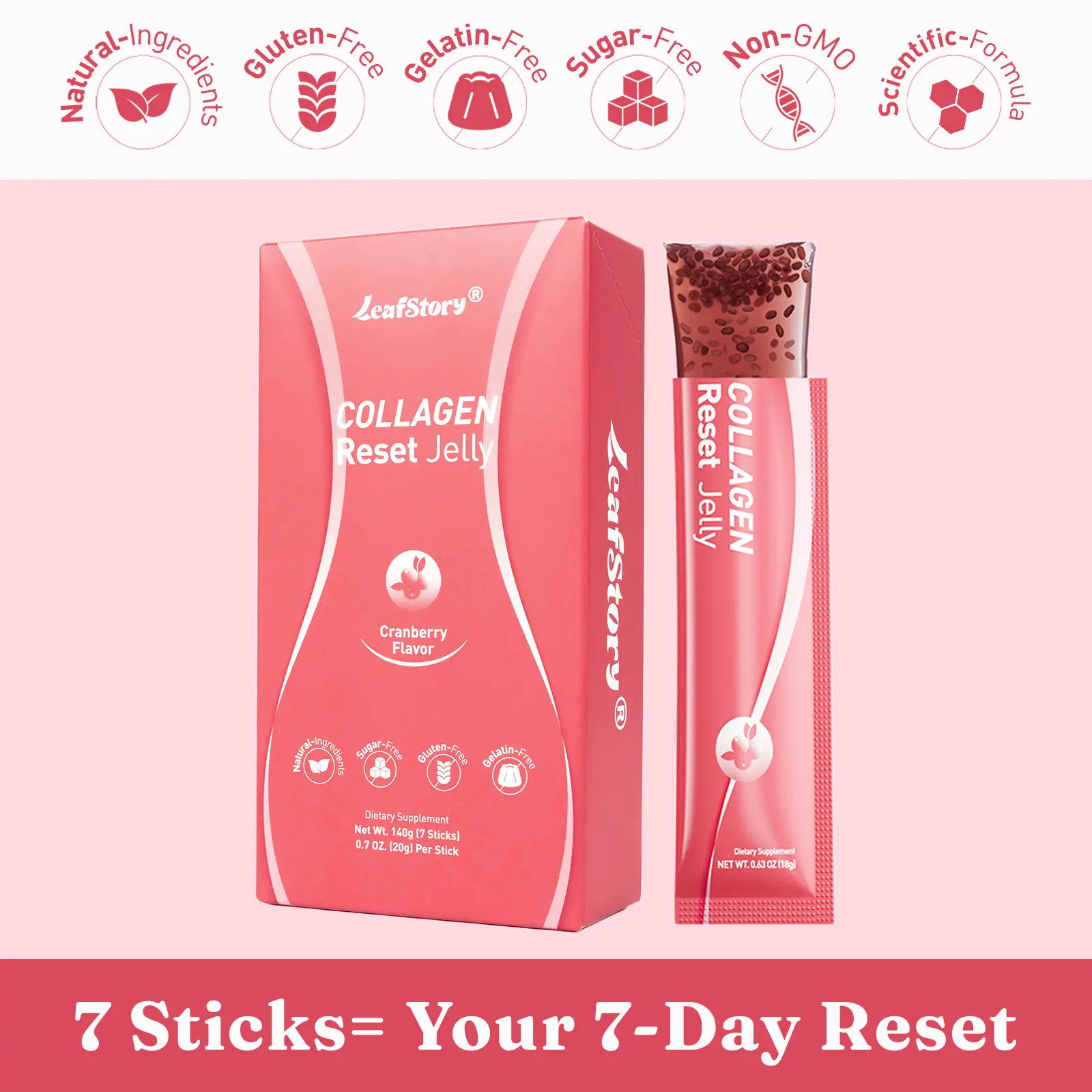 Elevate your health with the LeafStory Collagen Reset Jelly. This pack includes 7 sticks, offering a cranberry-flavored hydrolyzed collagen peptides gel. Perfect for digestion, gut health, and skin elasticity. It also supports hair, nails, and joint health. Sugar-free, gluten-free, and non-GMO, this product is gelatin-free.