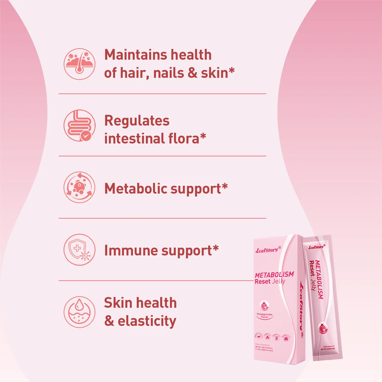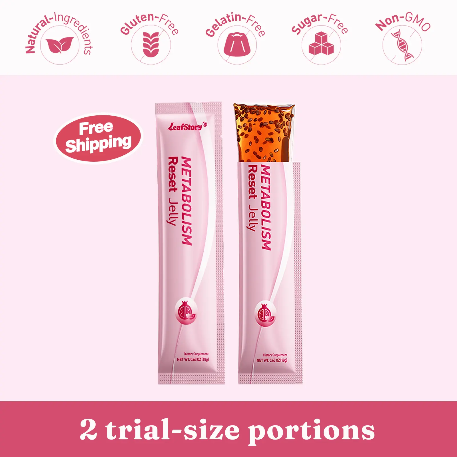 Elevate your health with the LeafStory Metabolism Reset Jelly! This pomegranate-flavored gel is designed to support metabolism, energy and skin & nails. It's gluten-free, non-GMO, and gelatin-free, all natural ingredients, making it a versatile choice. Each pack includes 2 sticks, perfect for daily use.