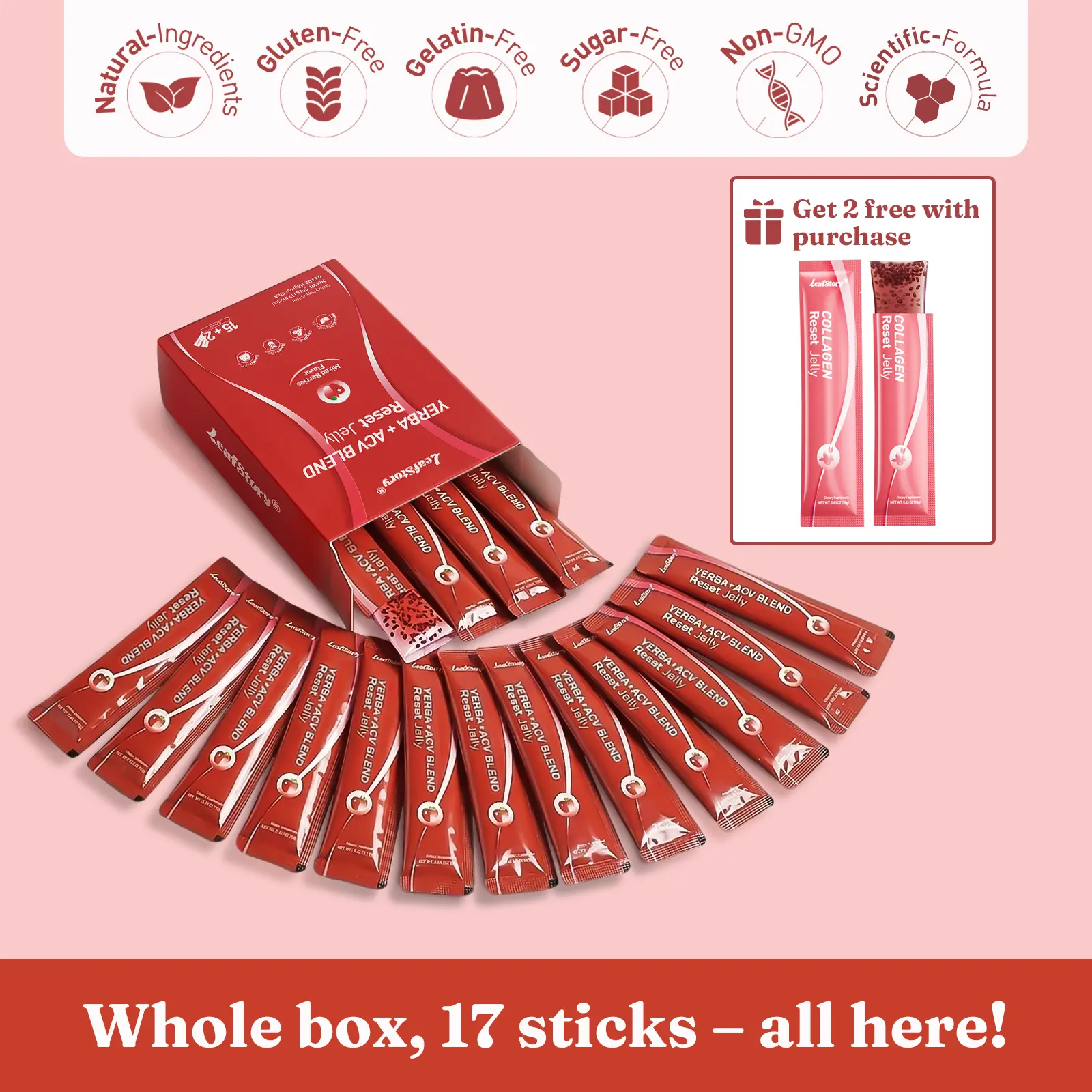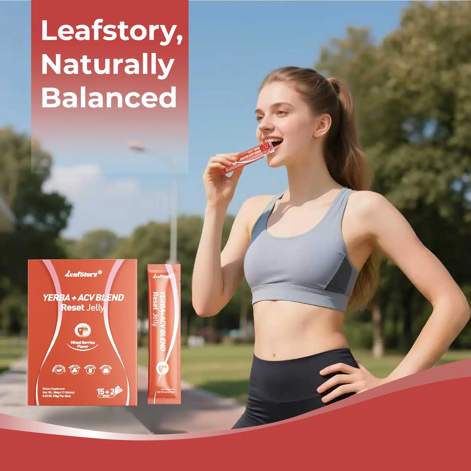 Discover the LeafStory Yerba + ACV Blend Reset Jelly. It supports digestion, Gut Health, Metabolism, and Focus. Each pack contains 7/17 sticks, ensuring you have enough for your journey. This sugar-free, gluten-free, and non-GMO product is gelatin-free, making it a versatile choice. Perfect for those looking to enhance their health naturally.