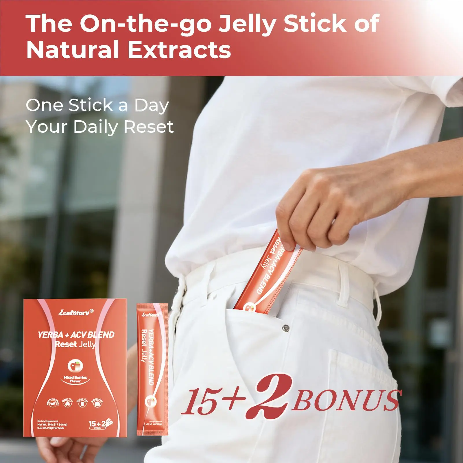 Discover the LeafStory Yerba + ACV Blend Reset Jelly. It supports digestion, Gut Health, Metabolism, and Focus. Each pack contains 7/17 sticks, ensuring you have enough for your journey. This sugar-free, gluten-free, and non-GMO product is gelatin-free, making it a versatile choice. Perfect for those looking to enhance their health naturally.