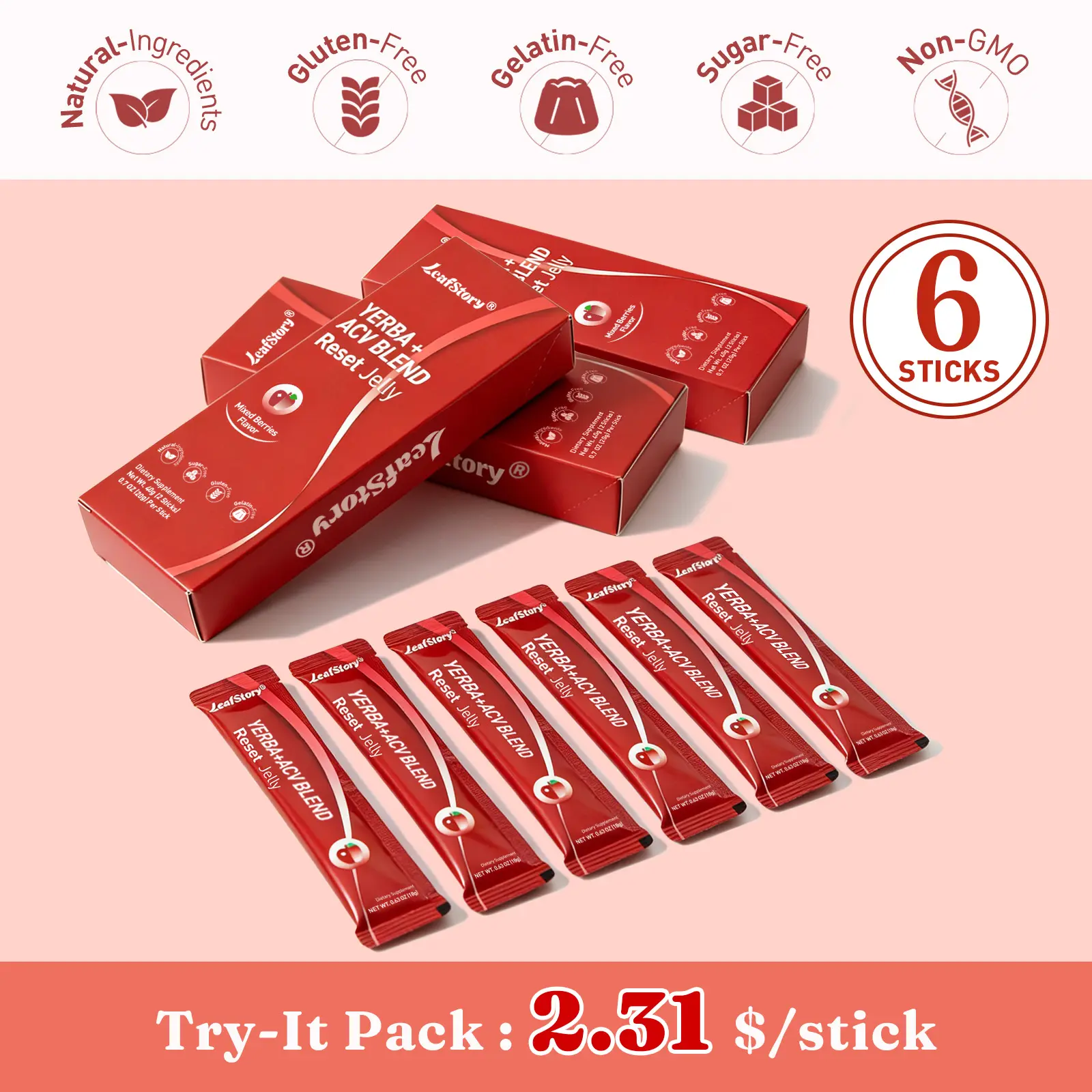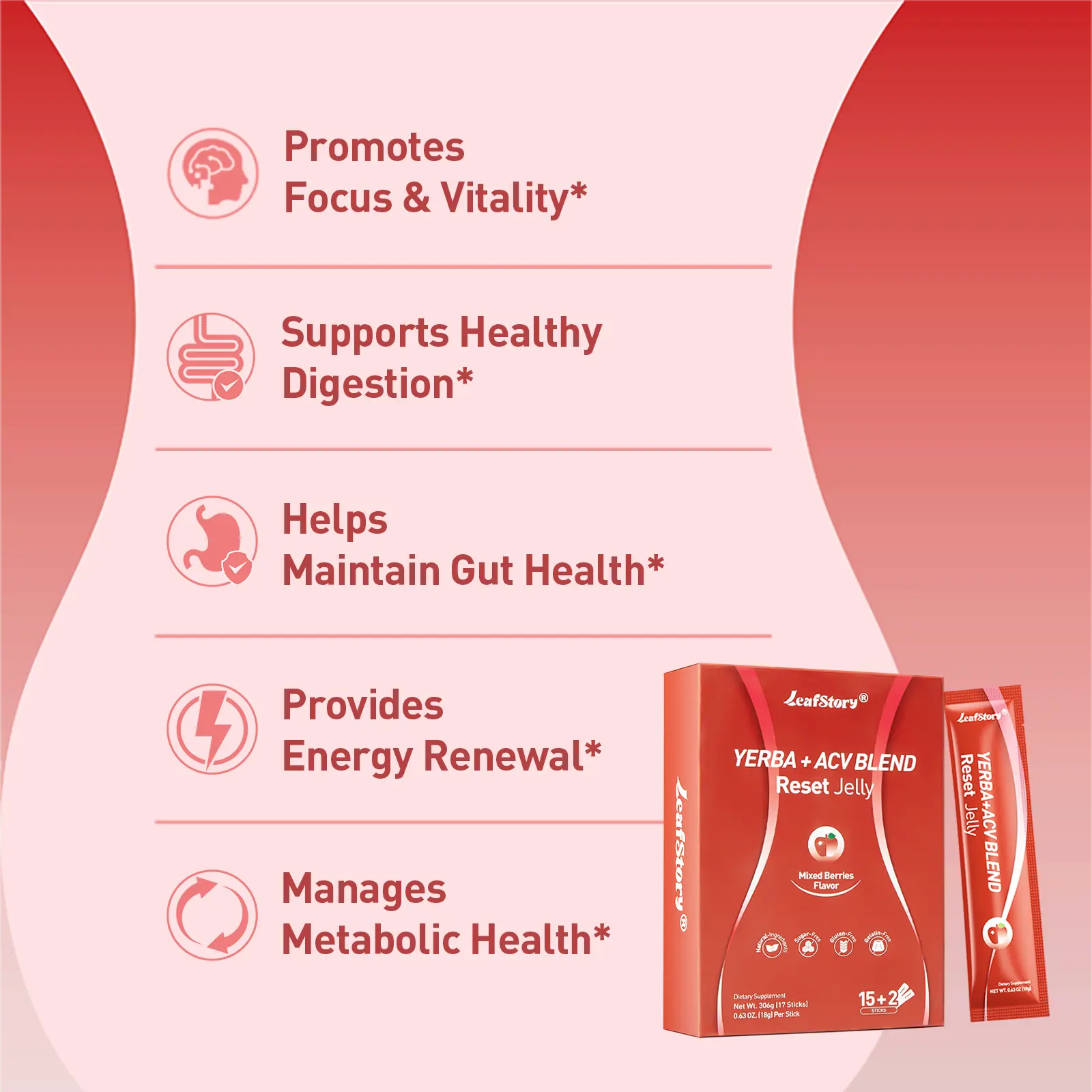Discover the LeafStory Yerba + ACV Blend Reset Jelly. It supports digestion, Gut Health, Metabolism, and Focus. Each pack contains 7/17 sticks, ensuring you have enough for your journey. This sugar-free, gluten-free, and non-GMO product is gelatin-free, making it a versatile choice. Perfect for those looking to enhance their health naturally.