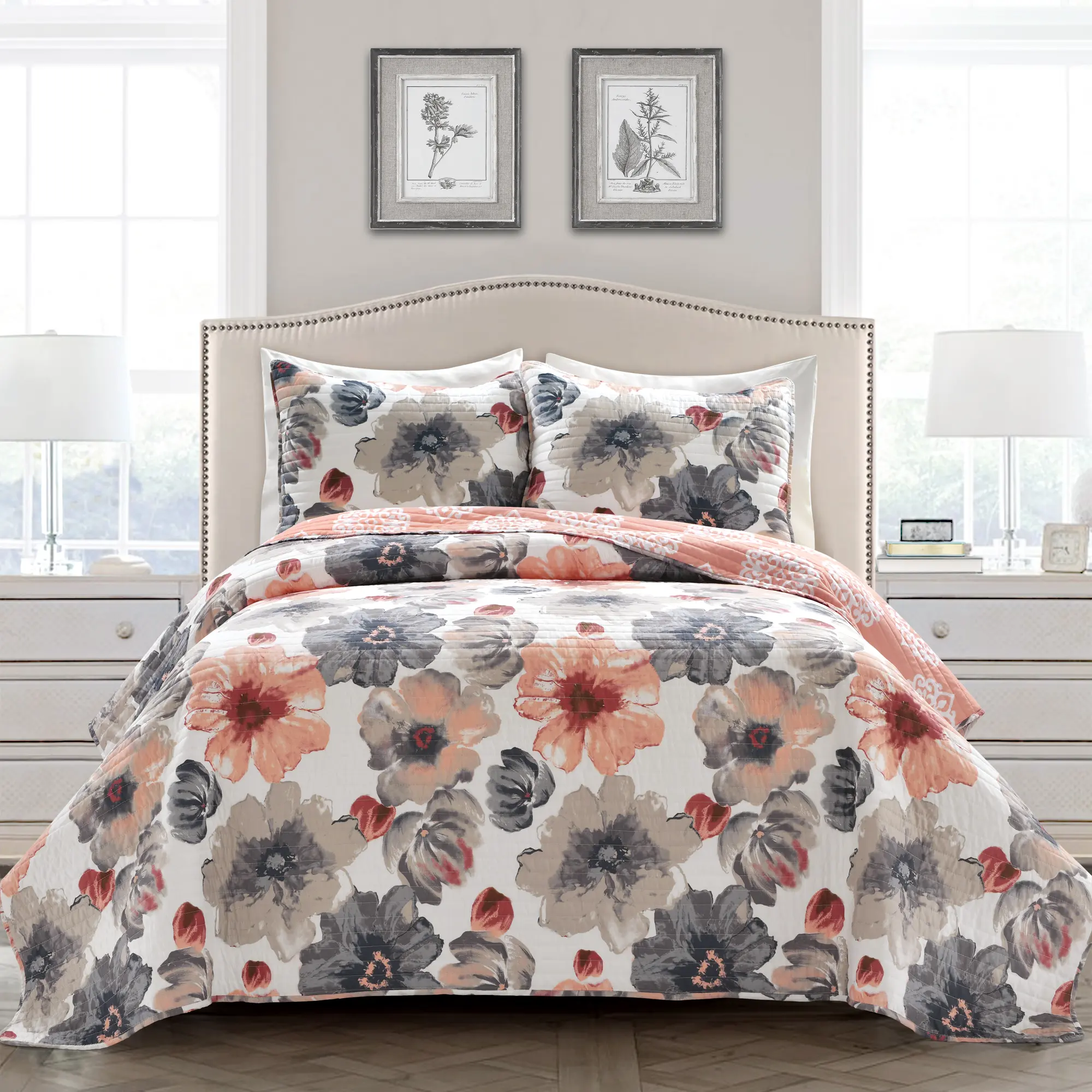 Elevate your bedroom with the Leah Quilt 3 Piece Set. The vibrant floral design adds elegance and fun, perfect for master or guest bedrooms. This set complements various design styles, creating a serene atmosphere. The soft microfiber material ensures comfort for sleep. Available in Full/Queen and King sizes, it includes a reversible quilt and two matching pillow shams. Choose from yellow/gray, blue, red/orange, purple, navy, and coral/gray options.