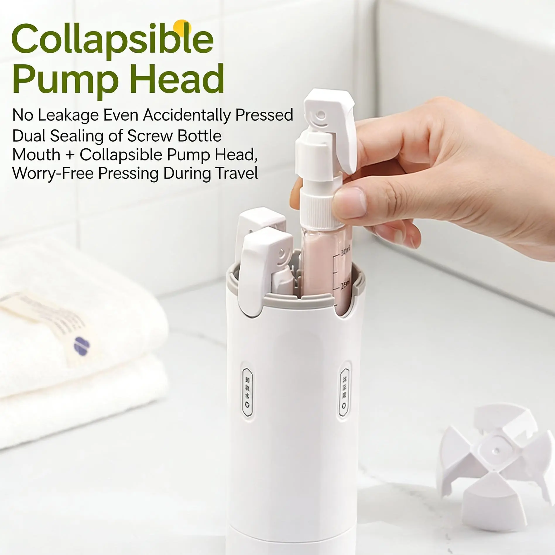 - After filling with liquid, tighten the inner lid and pump head, invert to check for leaks, and put it in the luggage only after confirming no leakage.