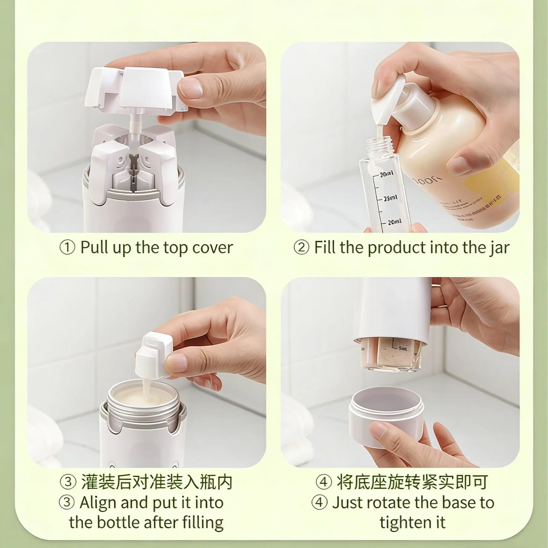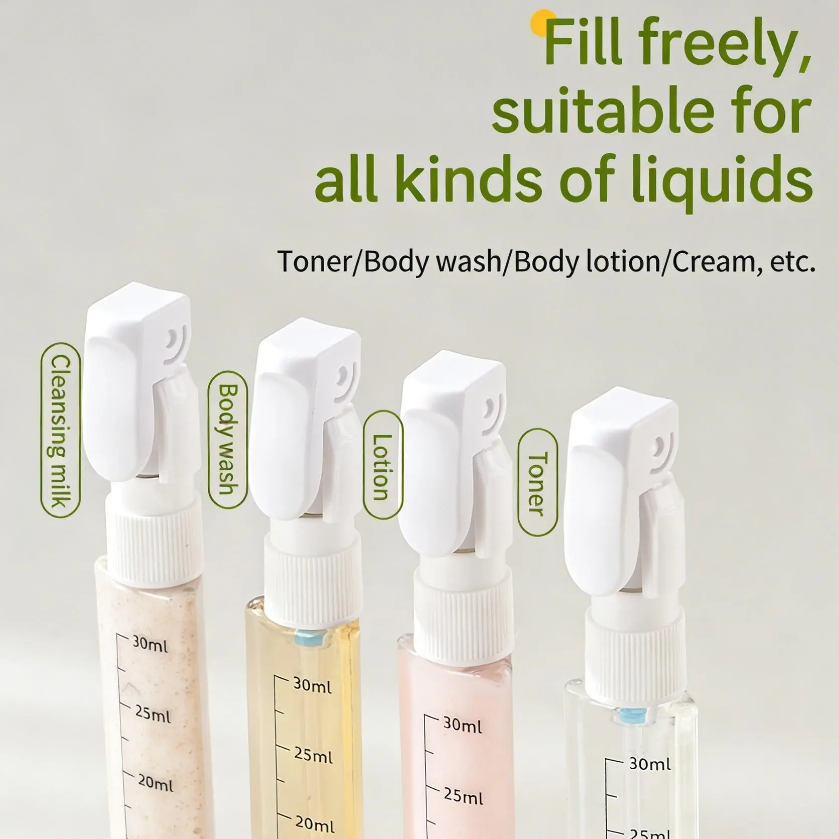- It is recommended to fill with toiletries and cosmetics with good fluidity (such as shampoo, lotion, essence). Avoid filling with paste-like or granular items to prevent clogging the pump head.