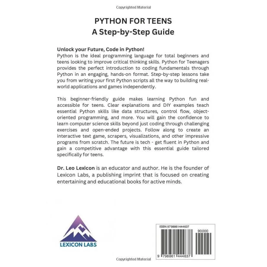 Python is one of the most popular and versatile programming languages used today. Python for Teens provides a comprehensive yet accessible introduction to Python tailored for teenagers and beginners. This book will take you from writing your first Python script all the way to building real-world applications and tools.