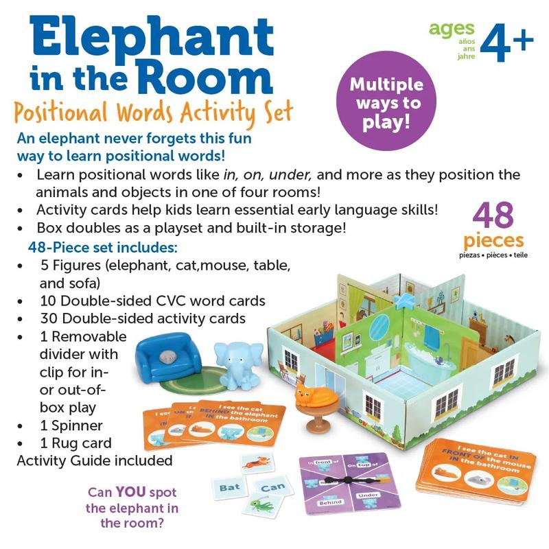 ·Multiple Ways to Play: Kids recreate a scene from the deck of 30 double-sided activity cards, use the spinner to see where the elephant goes, or play spelling and sight word games!