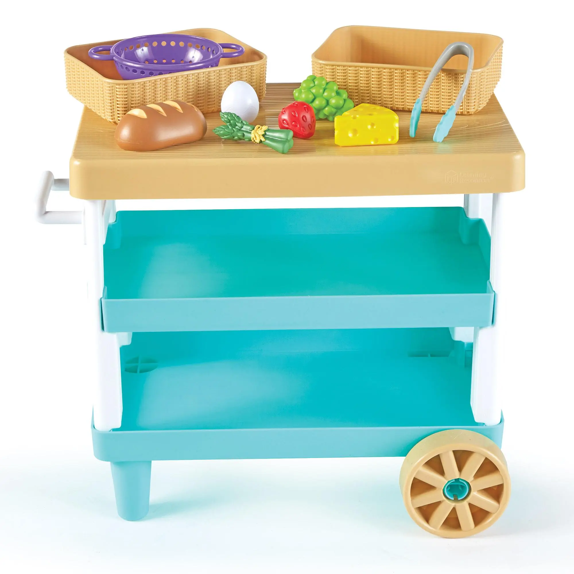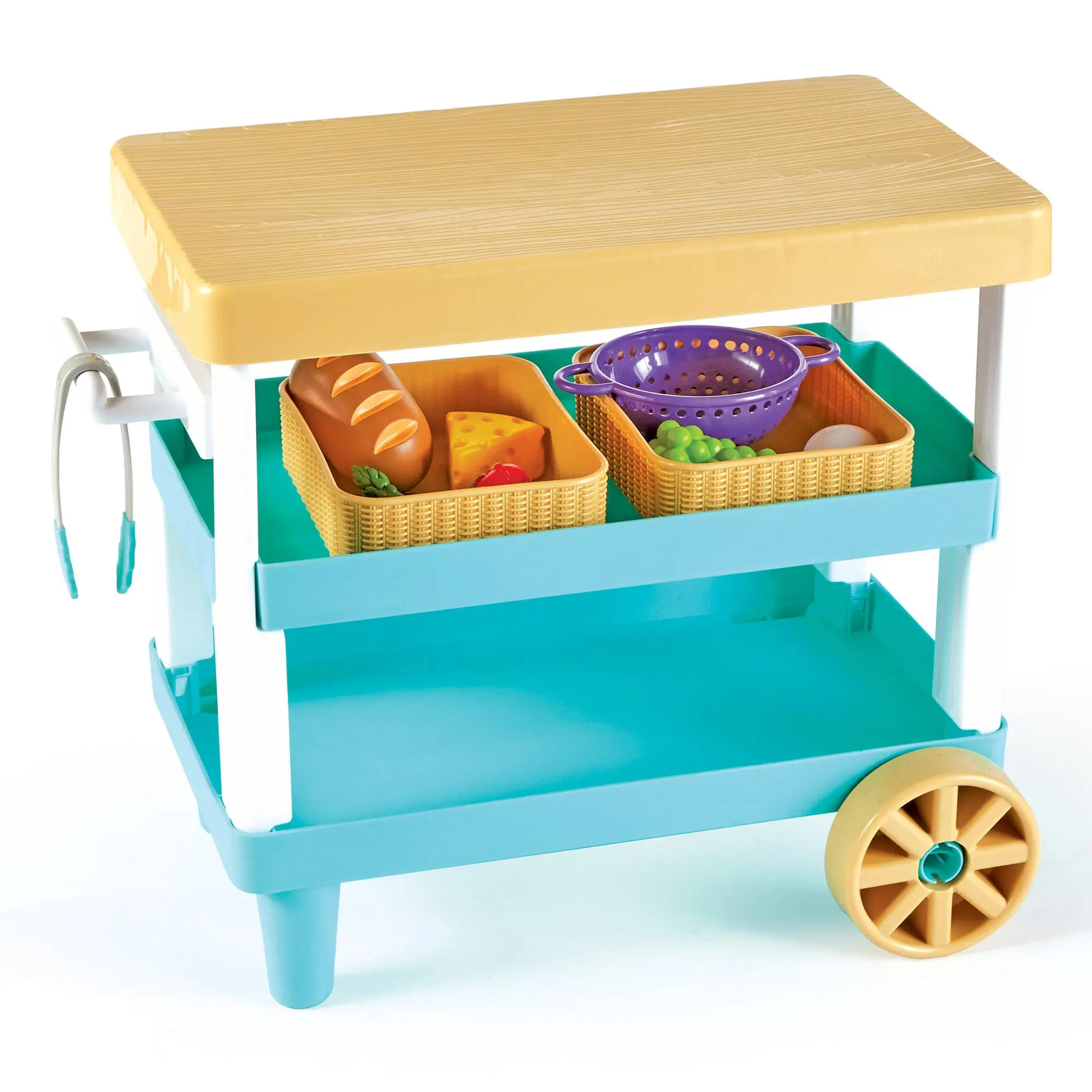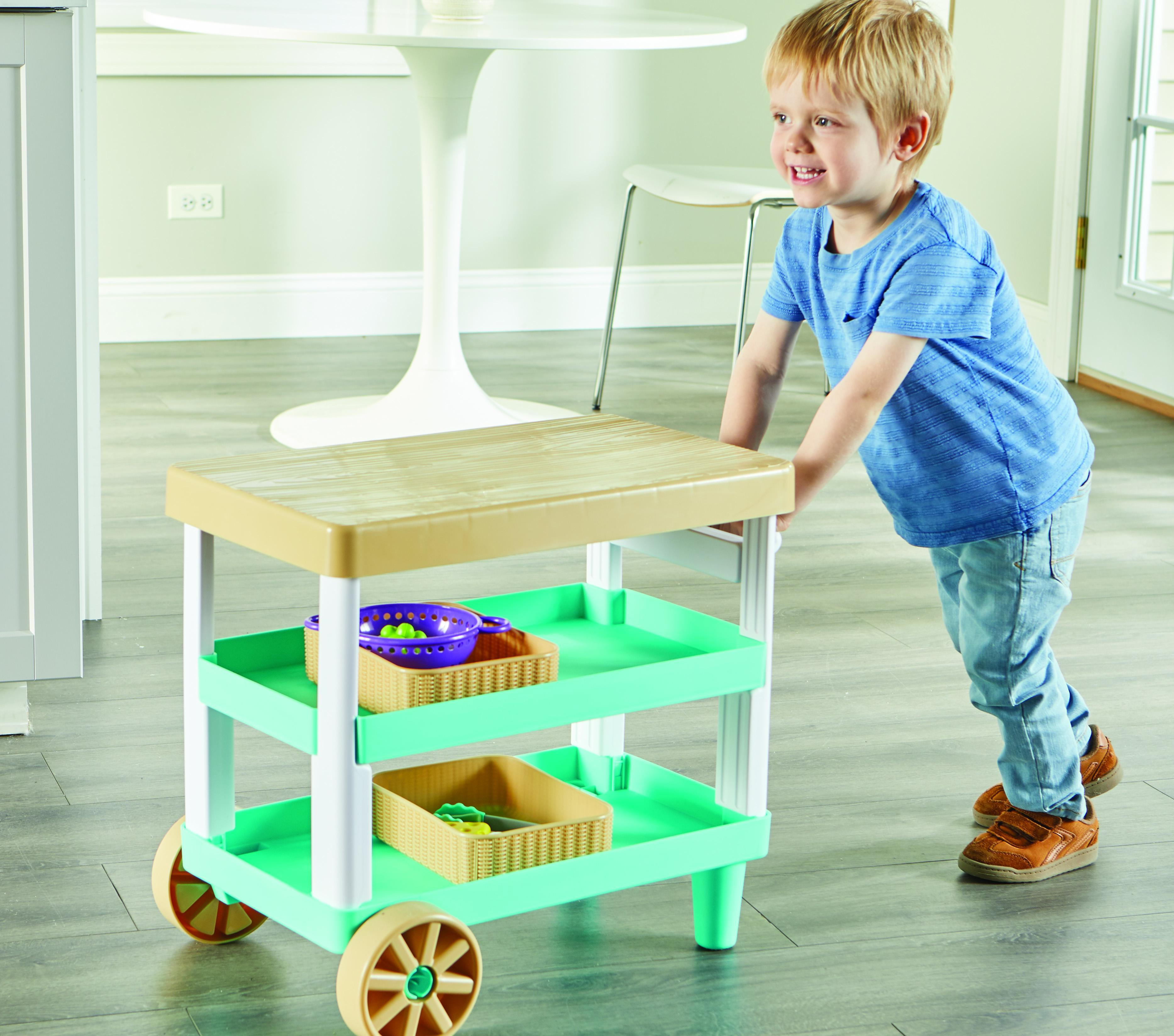 ·Rolling Storage Solution: With rolling wheels, a kid-sized handle, and two built-in storage shelves, this play kitchen cart is ready to store all kinds of play food for kids’ kitchens!