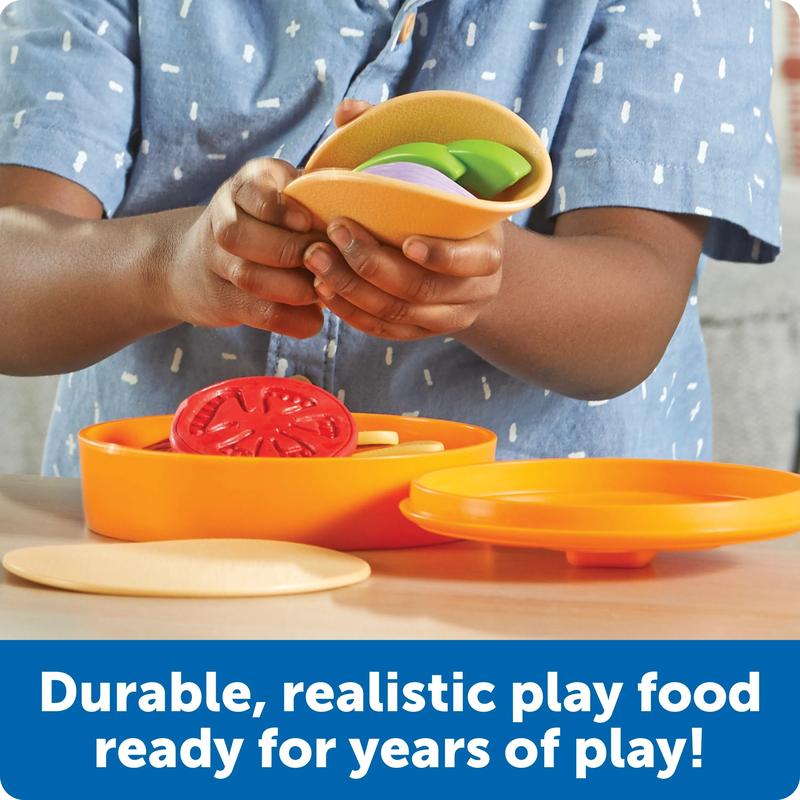 Kids discover everything they need for a tasty pretend taco night with this 28-piece play food set! The set includes a taco stand, tortilla holder, dippable chips, and guacamole. Perfect for pretend feasts, this set is ready for little ones to enjoy. 🌮