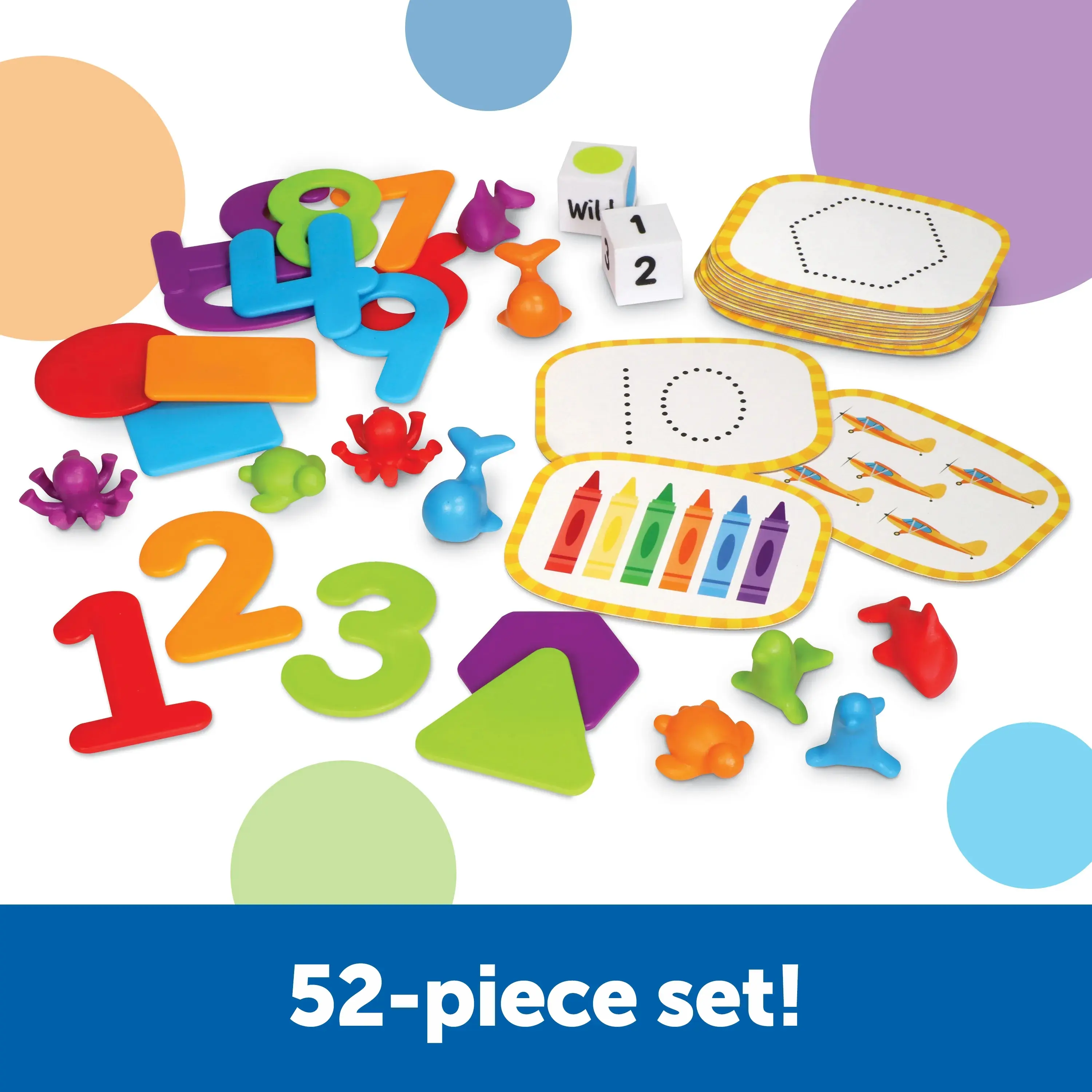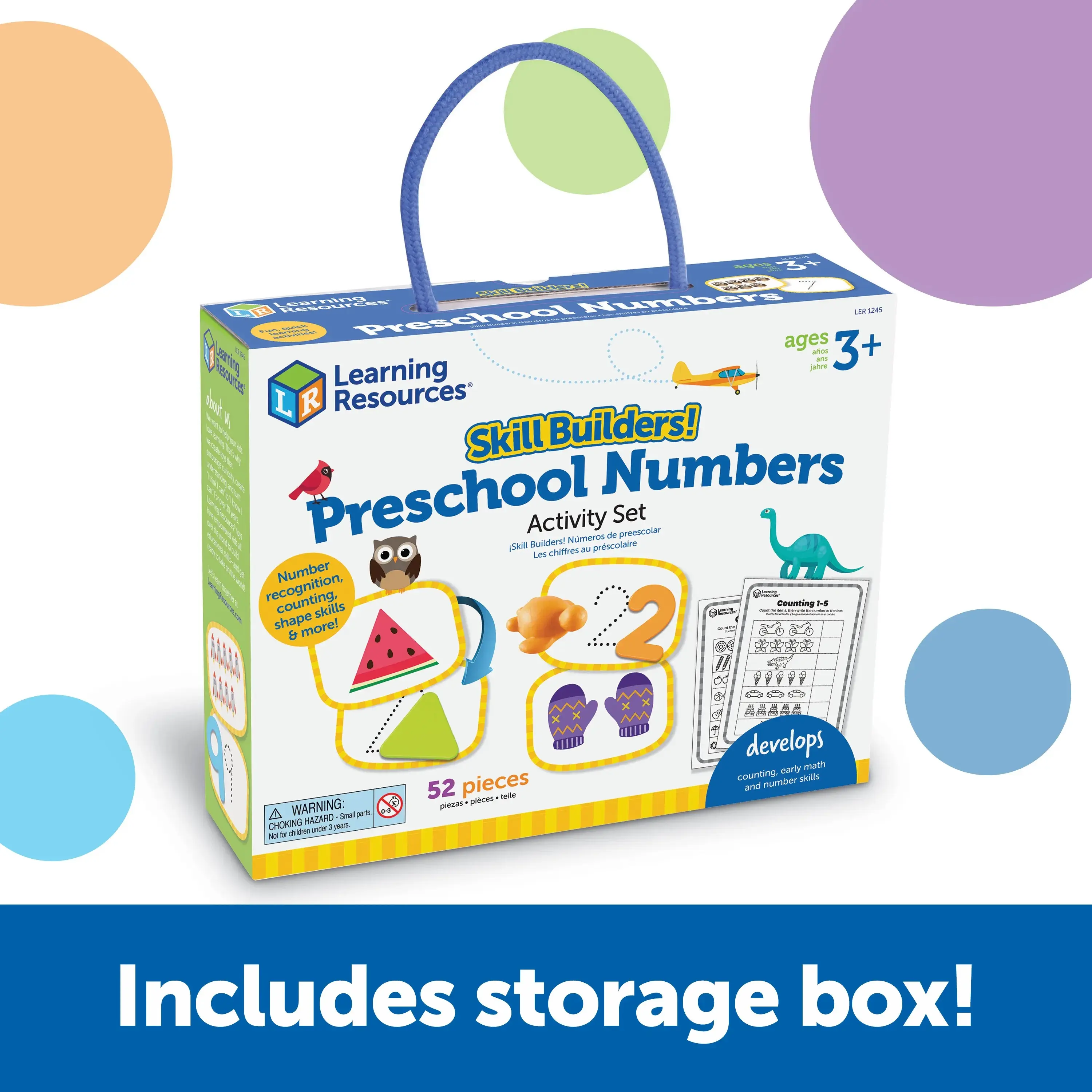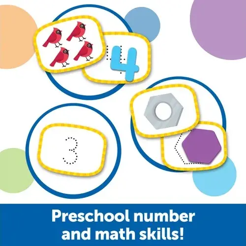 Play your way to preschool-ready skills with these fun, quick activaities! This 52-piece set's hands-on activities help kids learn and retain lessons in number recognition, counting, shapes, and other preschool number skills through fun, active play. Plus, the built-in carrying case lets you take the learning on the go!