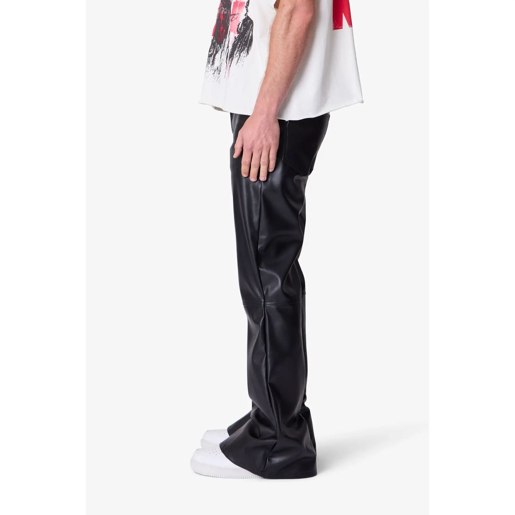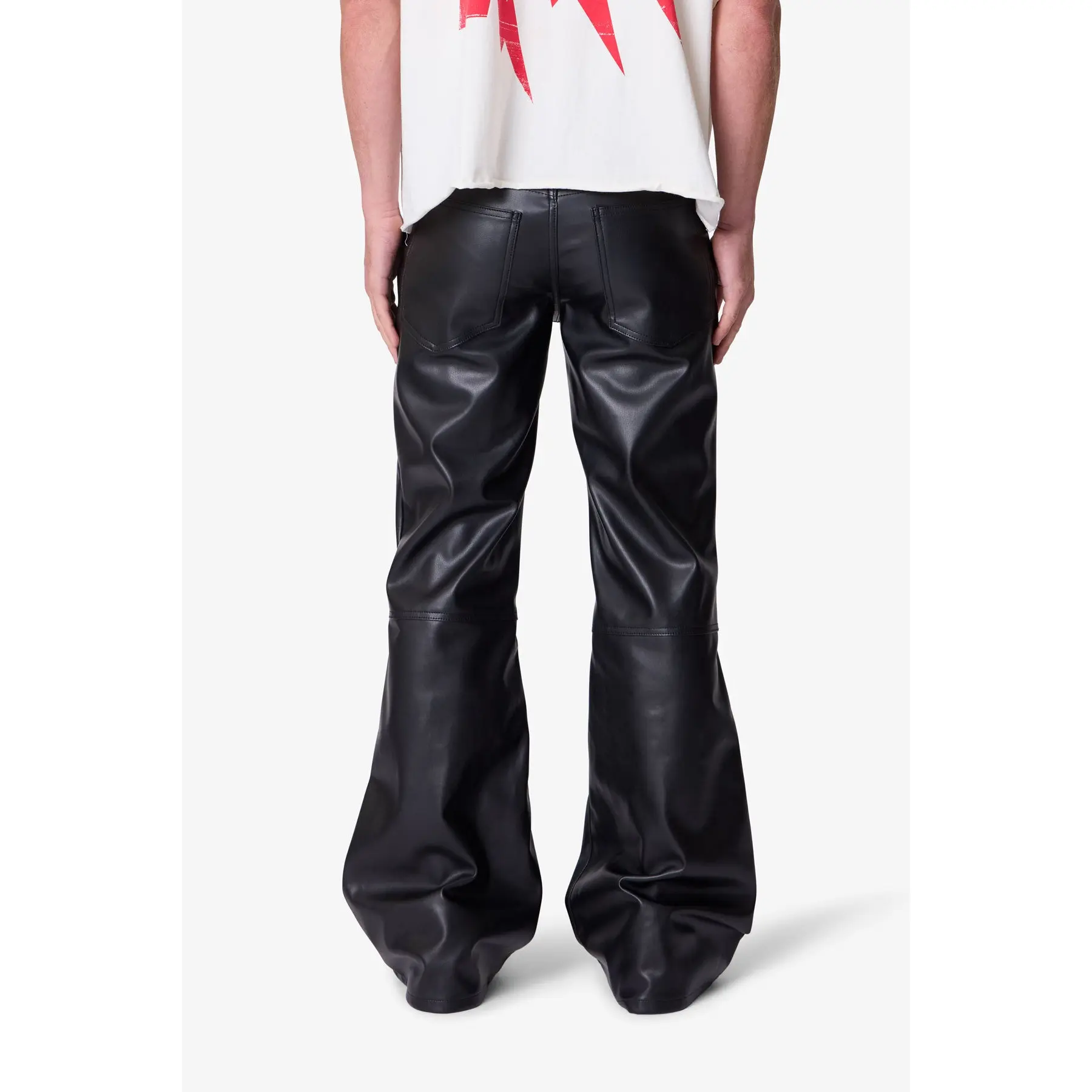 Crafted from premium leather, these flare pants bring sharp lines and retro edge to modern menswear. The tapered silhouette balances edgy flair with everyday wearability, while the versatile black hue pairs effortlessly with any wardrobe staple. Engineered for durability with California Prop 65-compliant materials. #mnml #mnmlleatherflarepant