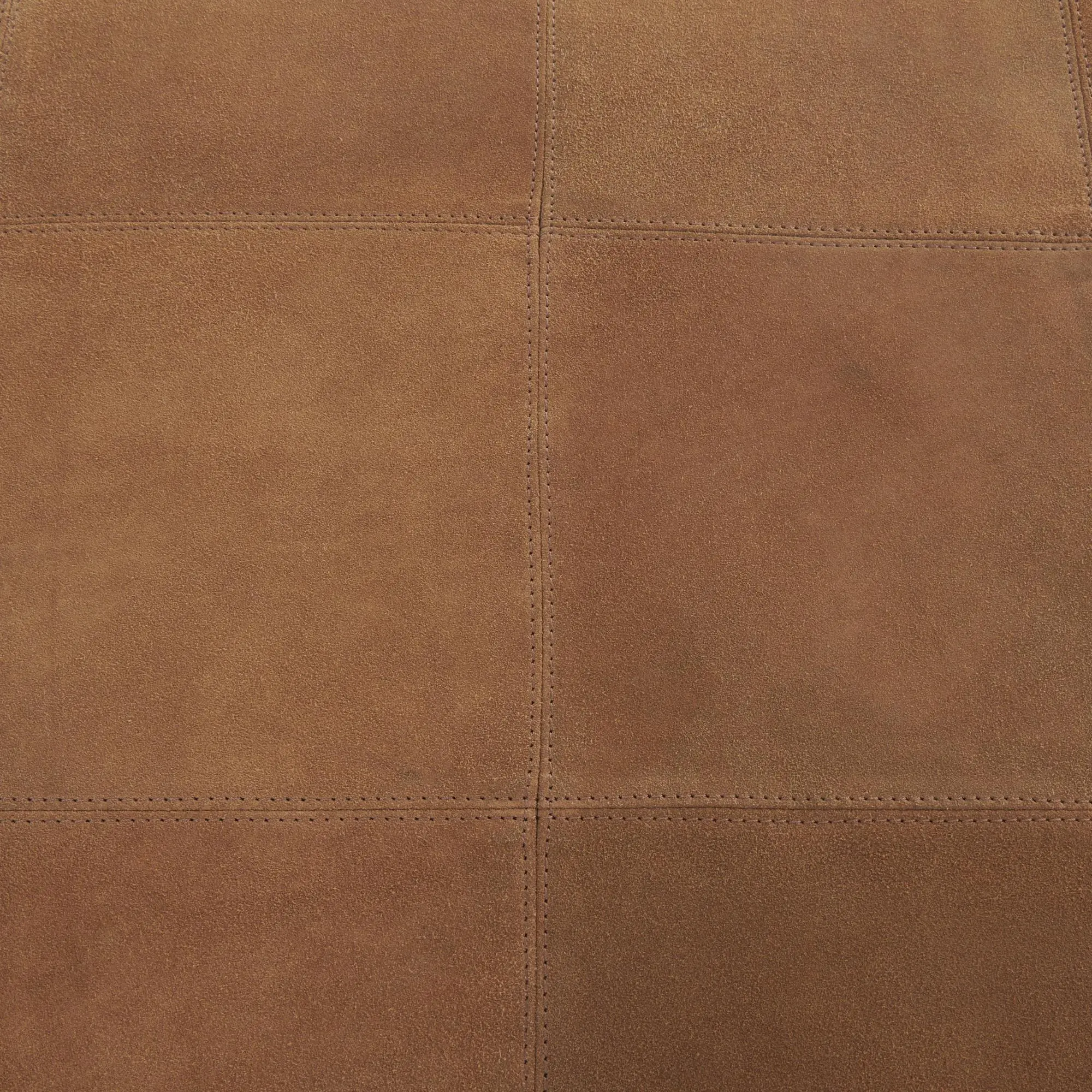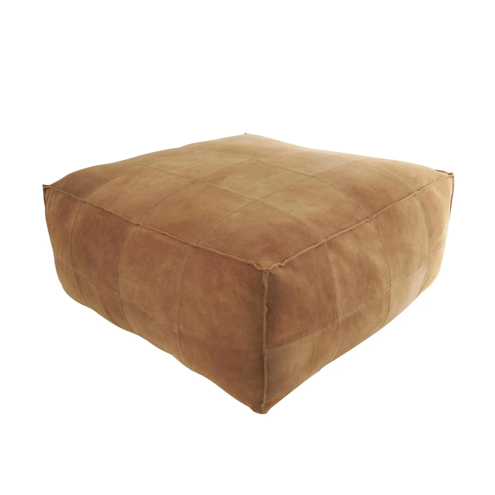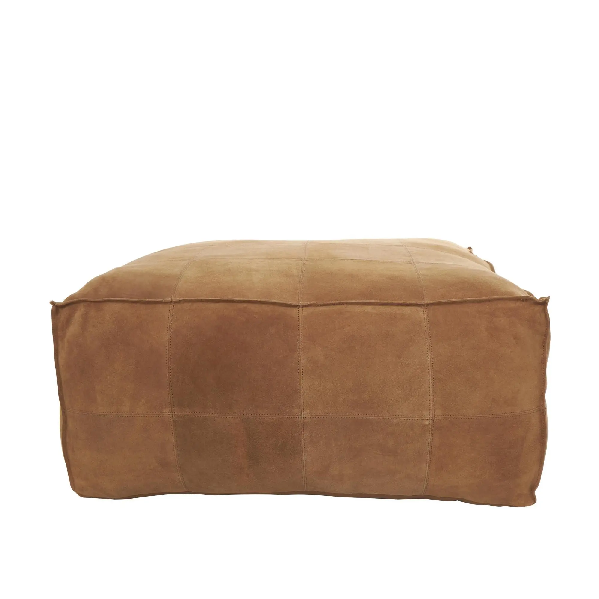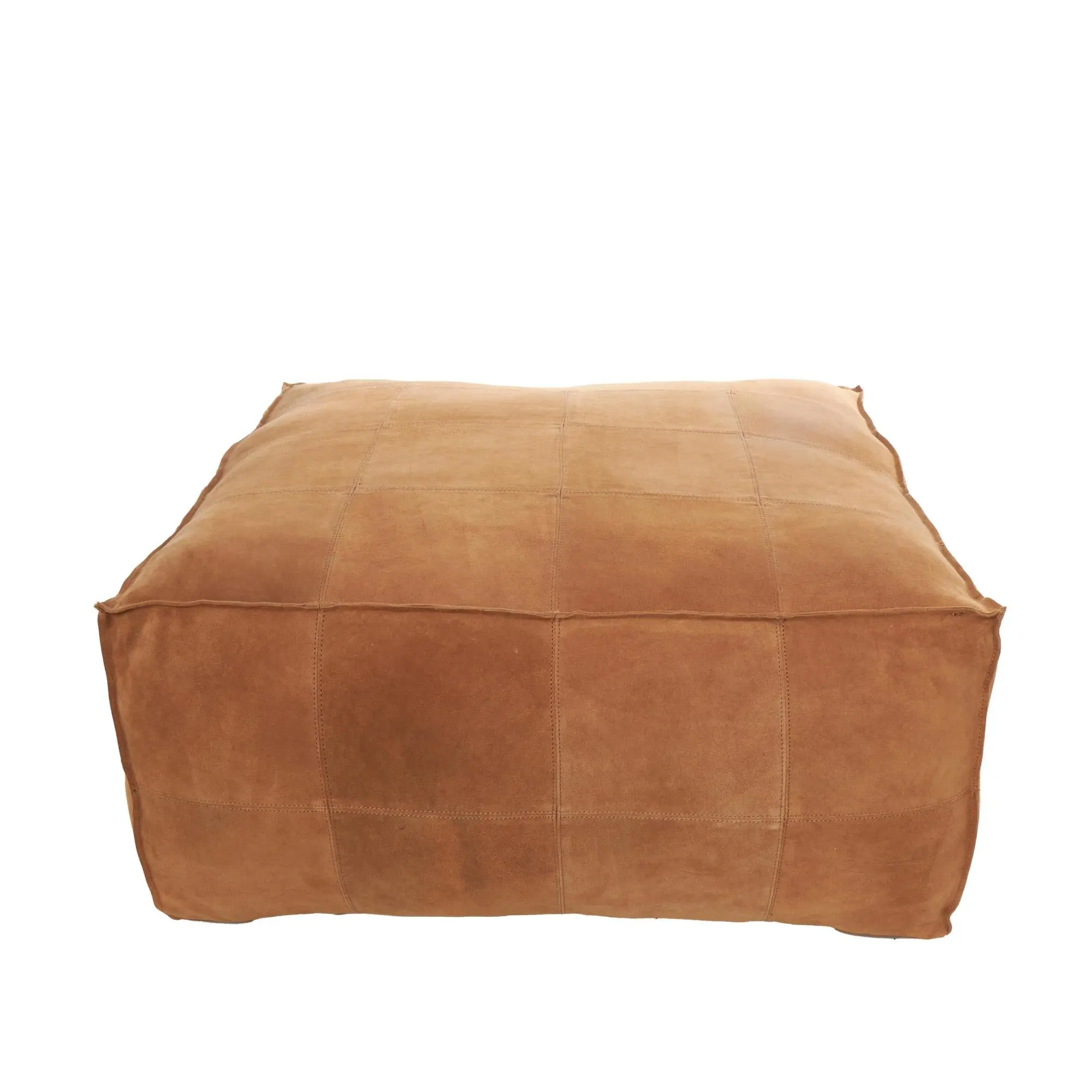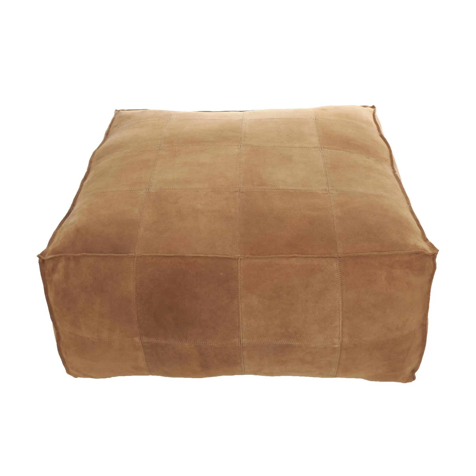 •The suede leather pouf features a stylish low-profile design with patchwork details and exposed stitching, making it an eye-catching piece that doubles as additional seating