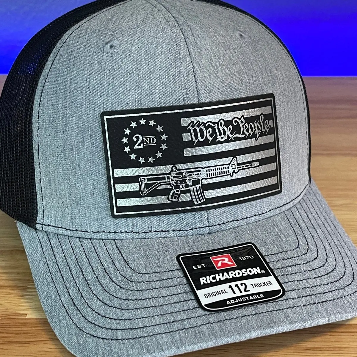 WE THE PEOPLE 2ND AMENDMENT AMERICAN FLAG PATRIOTIC Leather Patch Hat. Heather Grey/Black - Black/Silver Patch