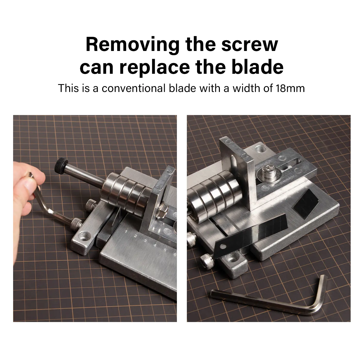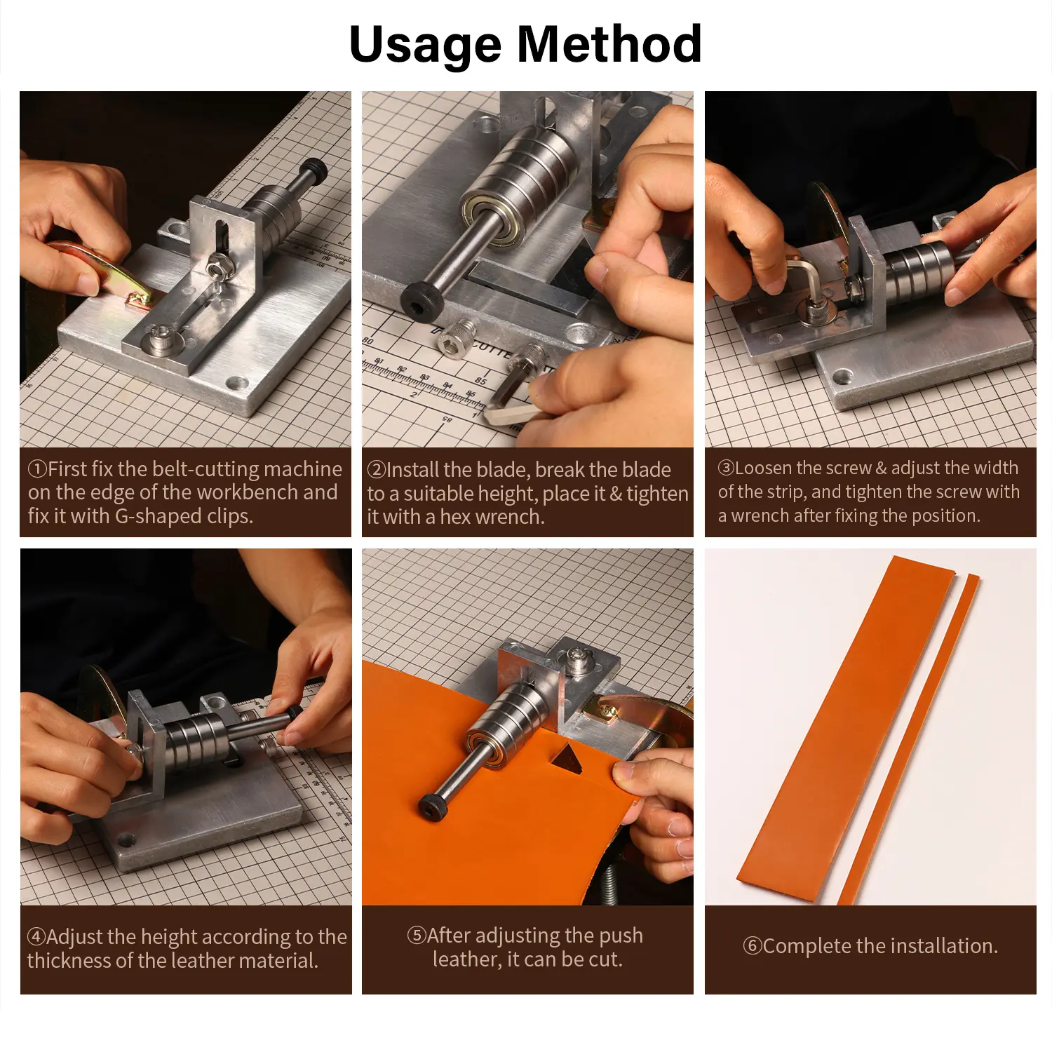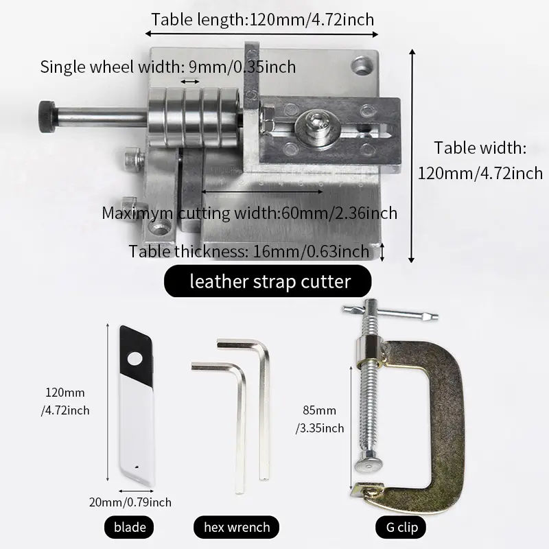 1. Manual Leather Strap Cutter: Equipped with 10 black sharp blades, 1 G clip, 8 hex wrenches, easy to adjust & replace, no need to purchase additional accessories; The cutter plate size is L120 x W120 x H86mm.