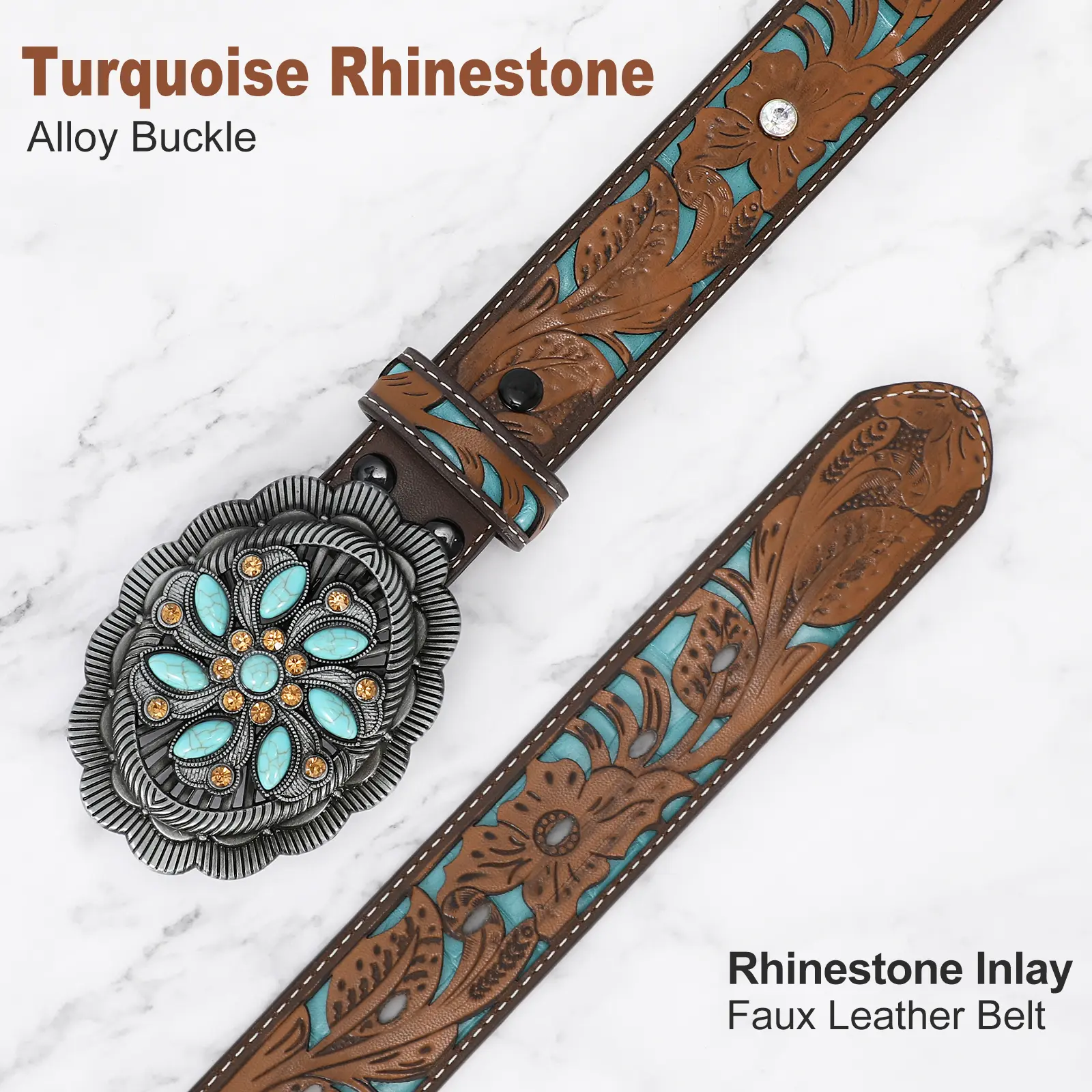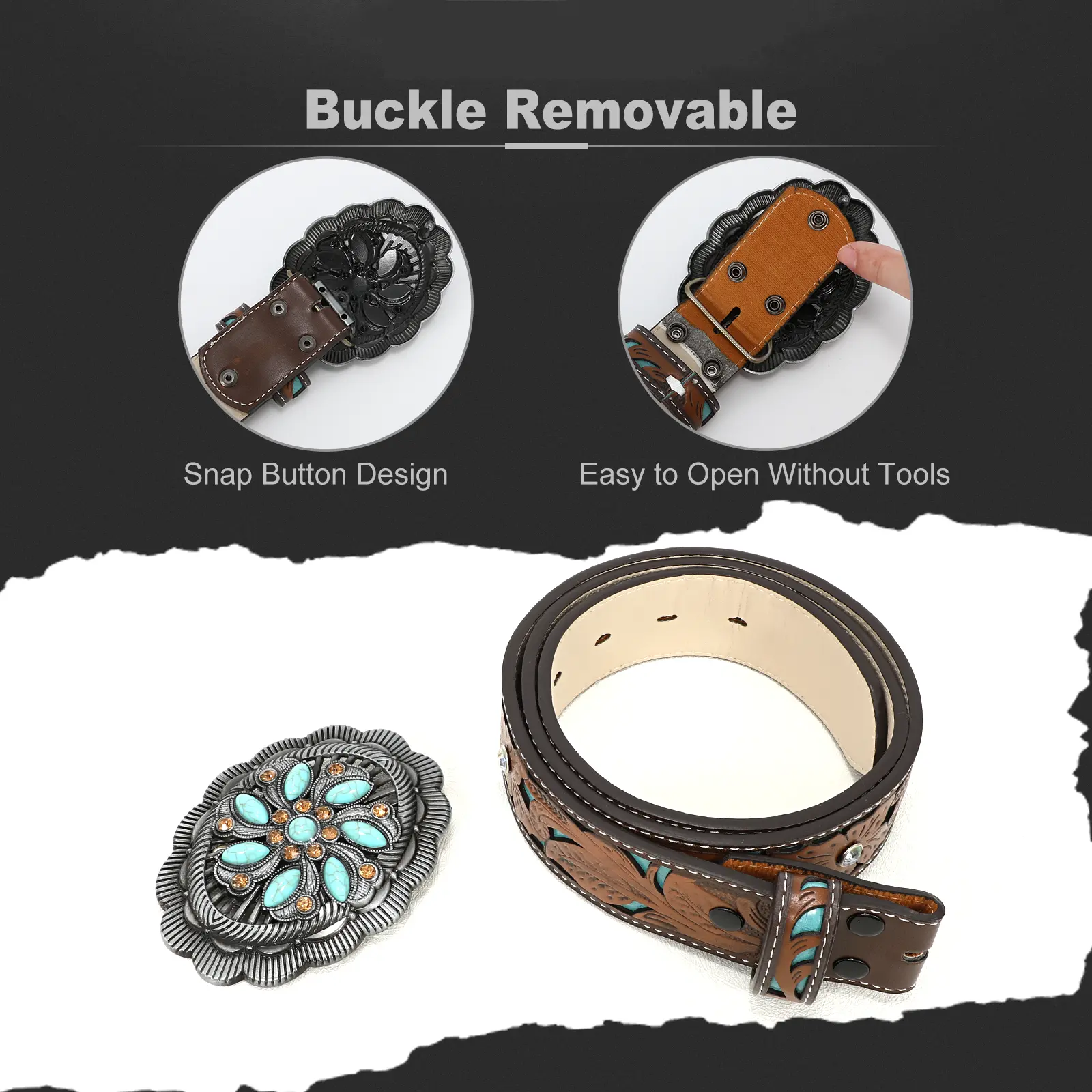Removable Alloy Buckle: Snap system for interchanging buckles making it for anyone everyday use and different occasions: a country concert, cowboy theme birthday gathering, rodeo etc. Embossed cowboy belt leather fits through regular 1.5" wide belt loops on jeans.
