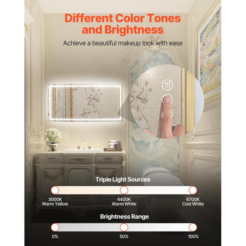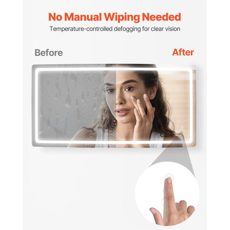 • One-Touch Anti-Fog: This led mirror for bathroom features an anti-fog function that quickly clears misty condensation. Whether in a humid environment or a bathroom after a shower, simply touch the anti-fog button, and the mirror will heat up to a constant temperature within 45s to clear the fog. This function can be turned on or off independently to save energy when not needed.