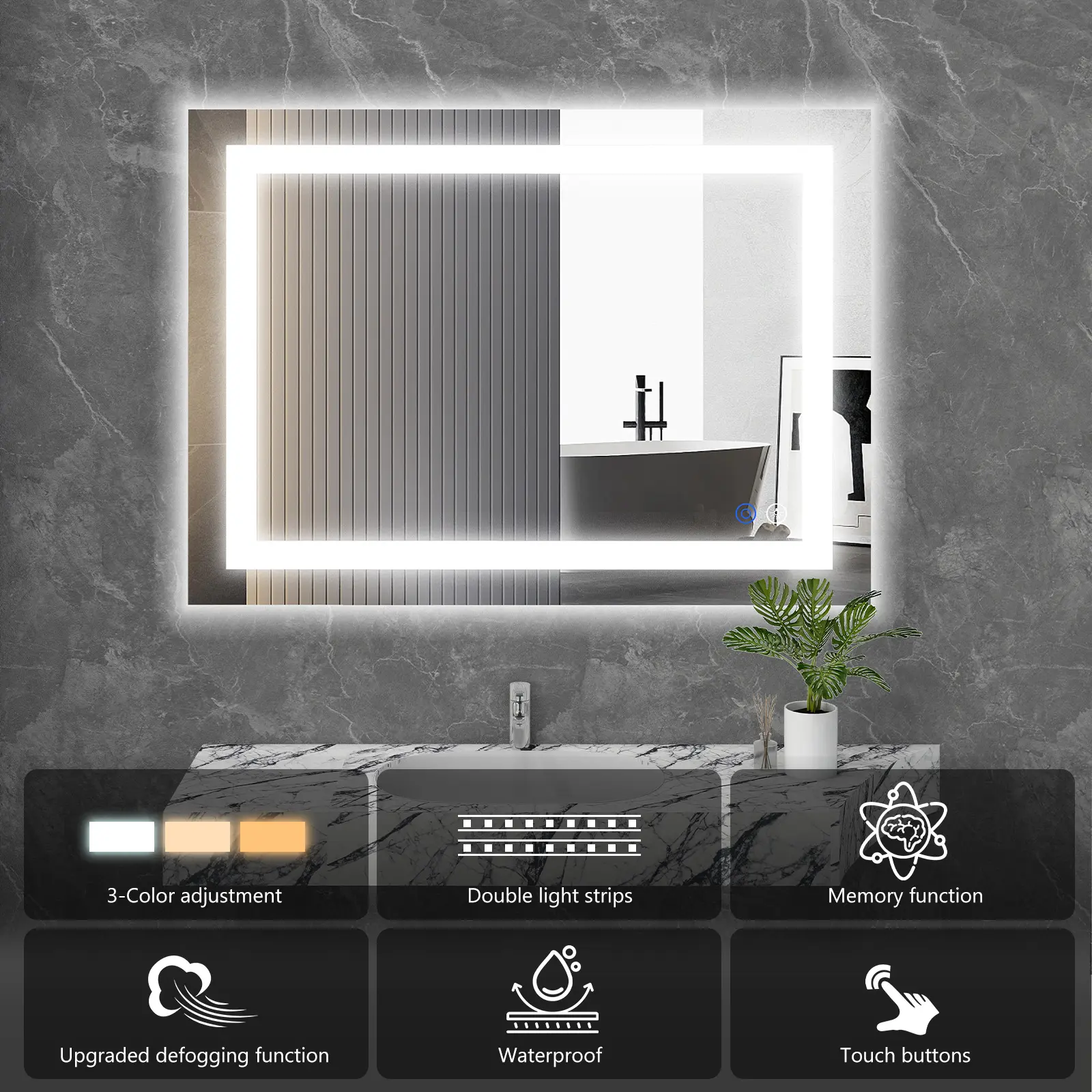·Backlight: Soft, ambient glow for enhancing bathroom aesthetics.