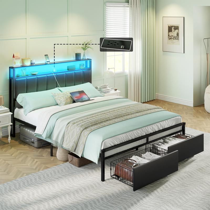【LED Bed Frame】Equipped with an RGB LED light strip offering a million color options, including static and four dynamic modes, also features brightness adjustment and remote control functionality via remote or app.