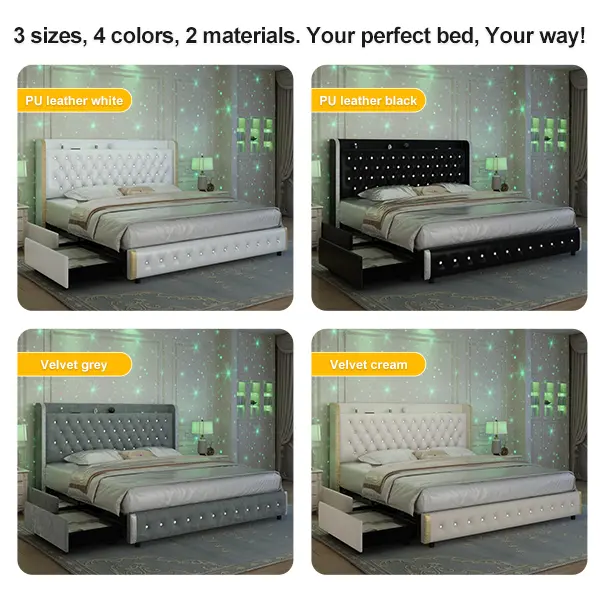 1.This is the introduction of the Starlight bed frame with drawers, he comes with 4 dust drawers. Available in 3 sizes, 2 materials and 4 colors.