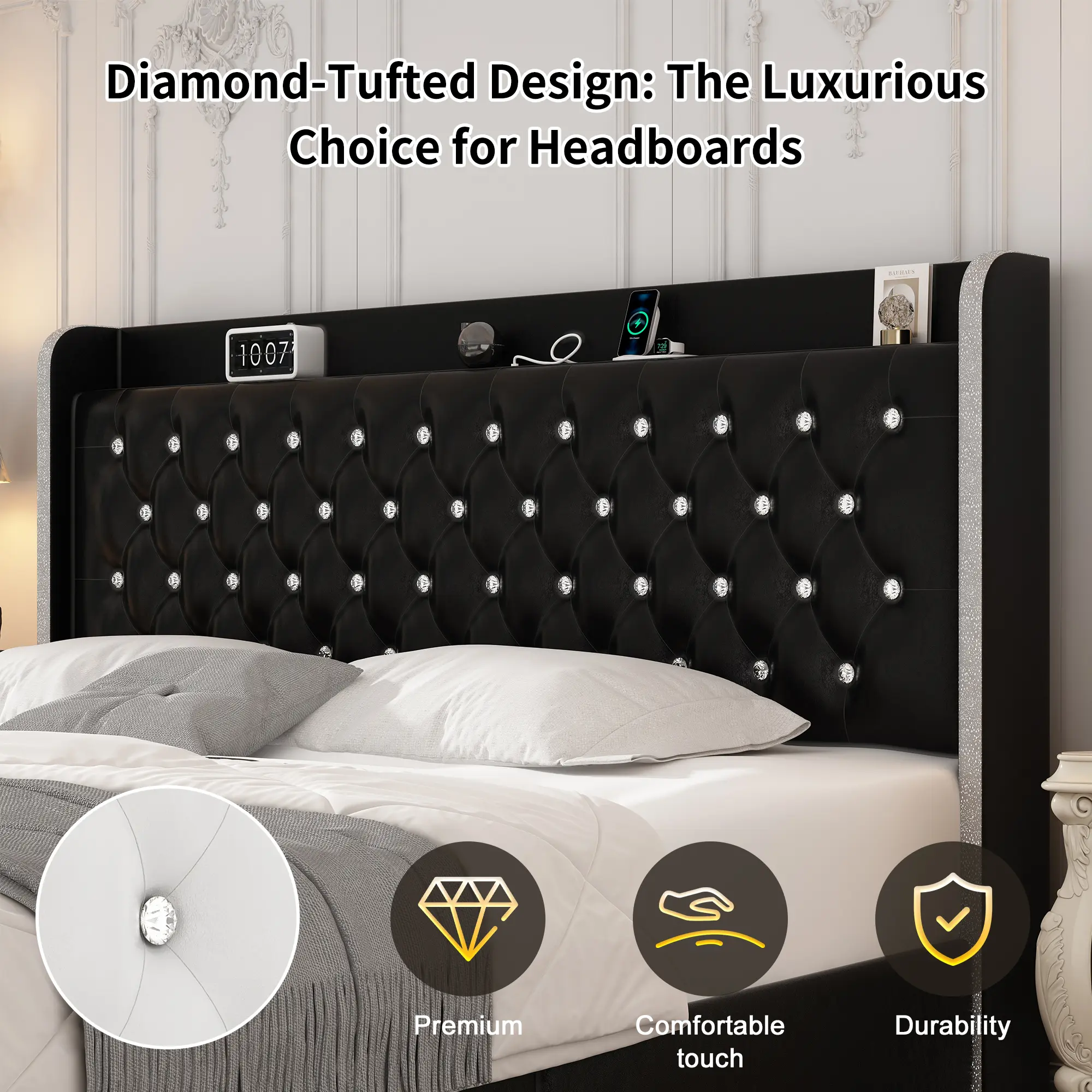 ·Elegant and easy-care PU fabric: Stylish white PU material with diamond stitching and crystal buttons. Soft upholstery for extra comfort and 46-inch headboard height fits all sizes of mattresses. (You can also choose velvet fabric bed frame, he is very soft and comfortable, a little bit of plush to bring a cozy feeling to your home)