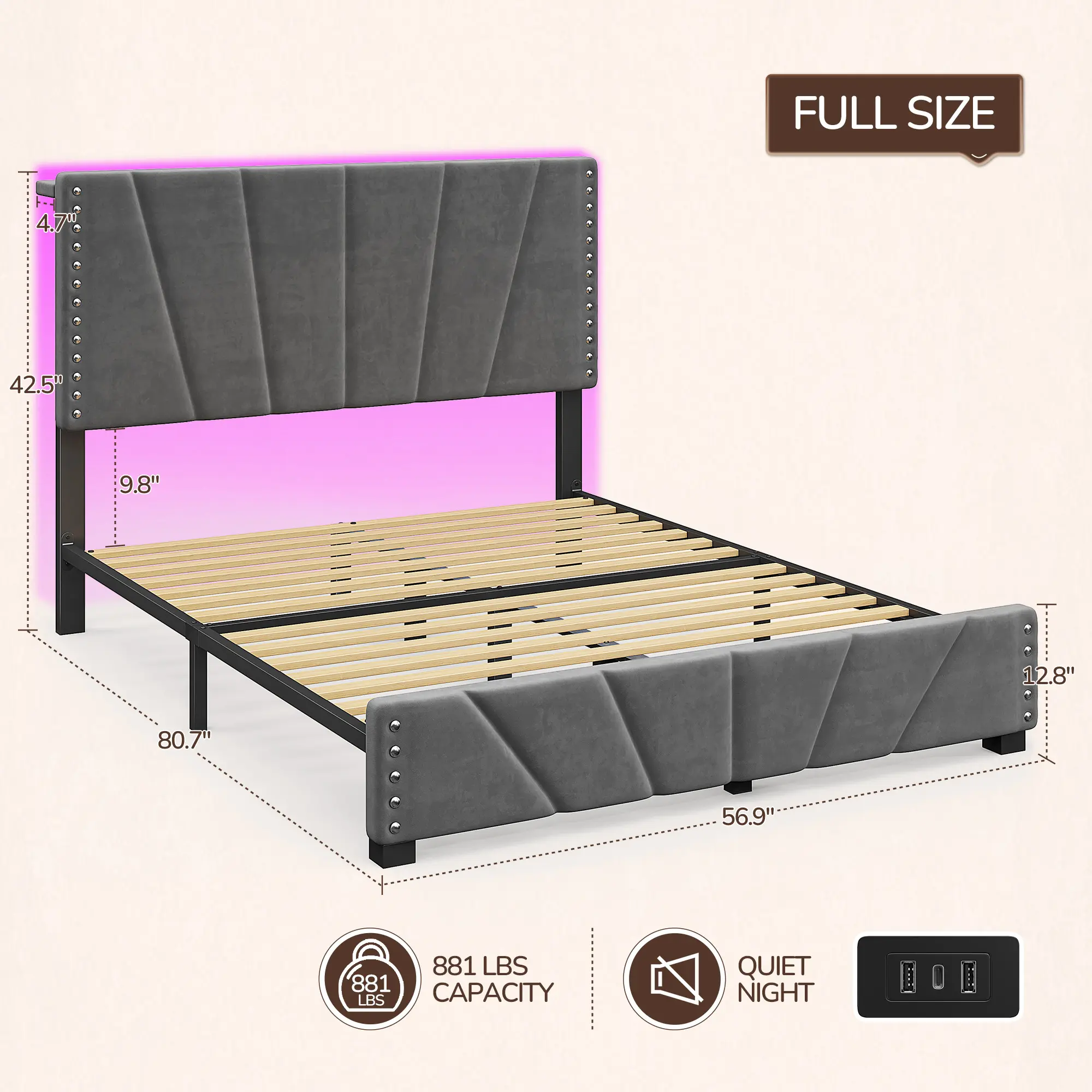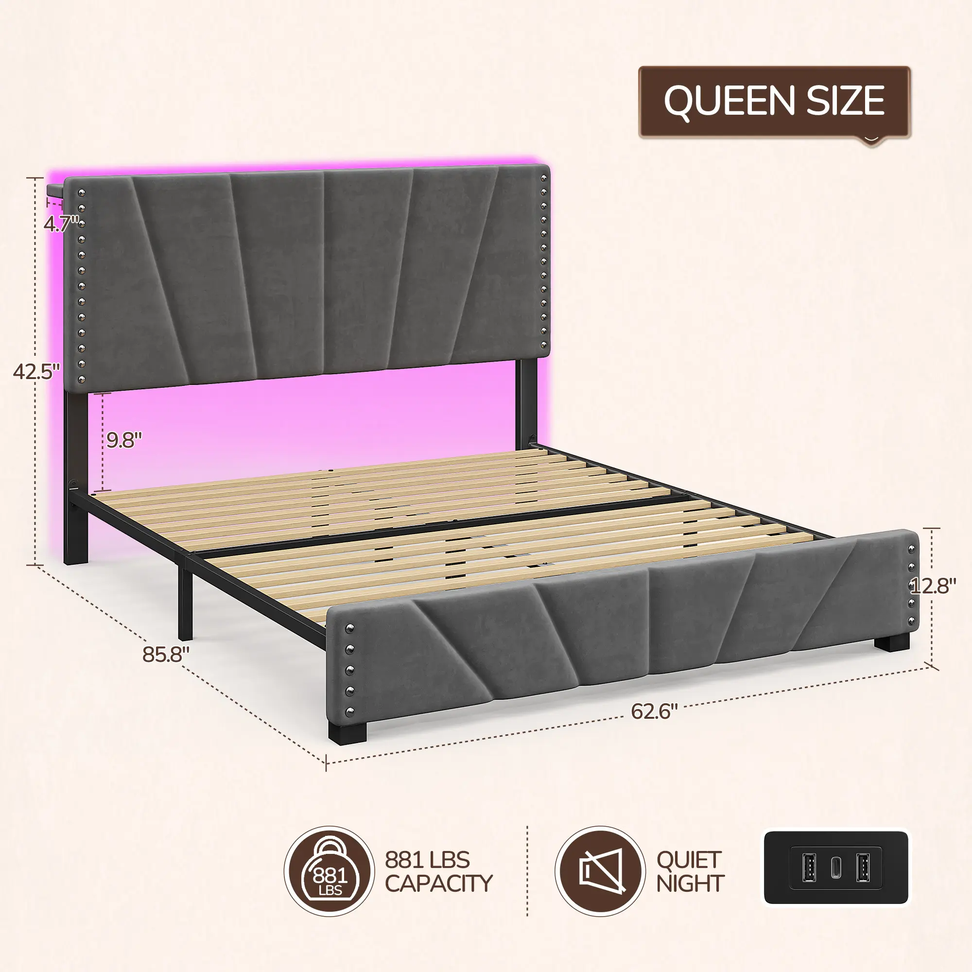 ·Comfortable Sleep: The velvet headboard and sturdy wooden slats support provide a cozy and supportive environment.