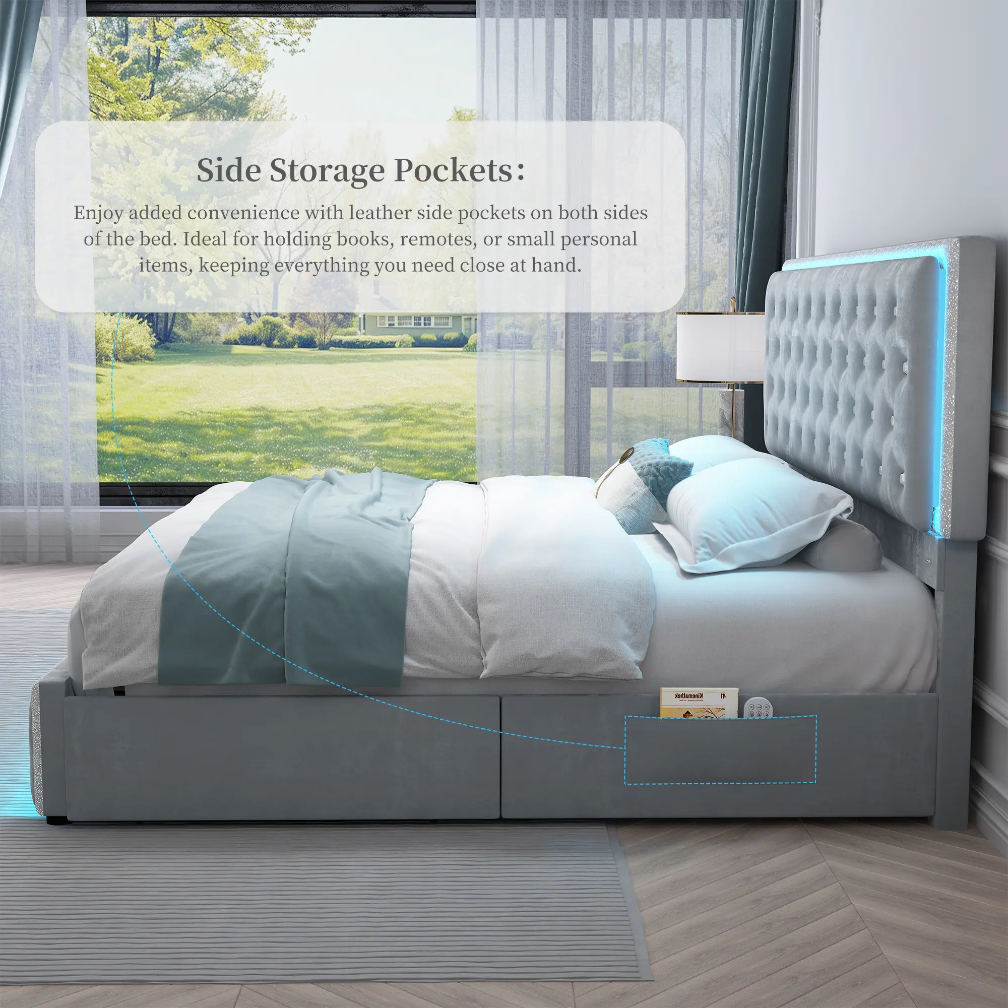 Transform your bedroom with this queen-size bed frame, designed with customizable LED lighting to match your mood. Easily adjust brightness and colors via remote control or mobile app, and even sync lights to sound for a dynamic, relaxing space. A stylish and functional way to enhance your room’s vibe with energy-efficient lighting