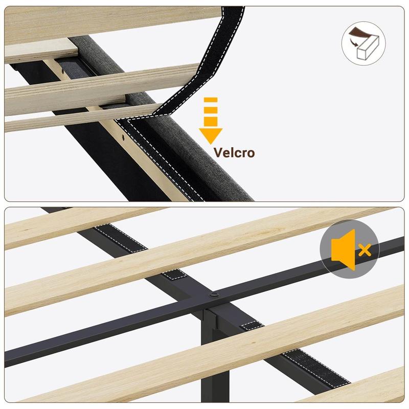 Made of sturdy metal structure and solid wood slats, this full platform bed frame is strong & stable for long-term use. Sturdy wooden slats are fixed by sound-absorbing vecro and quick-lock system. All parts and tools are labled with number for quick setup. Time & energy saver!