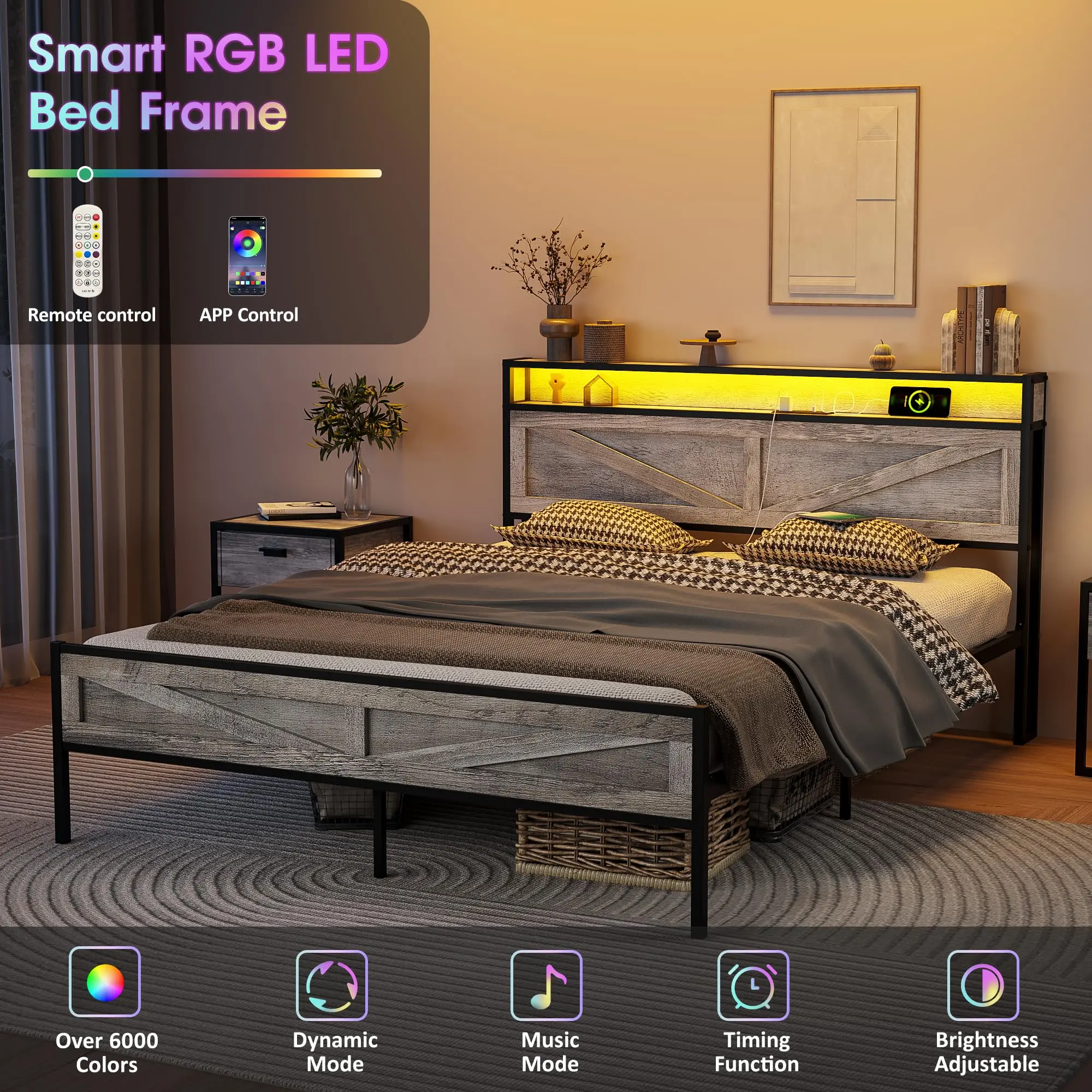 ·[ LED Lights Bed Frame ] This is a bed frame with LED lights. There are 20 colors of light options, which are divided into action and static modes, you can also adjust the speed and brightness.. Using the remote control or switch control to create atmosphere for your bedroom at night and display the light show.
