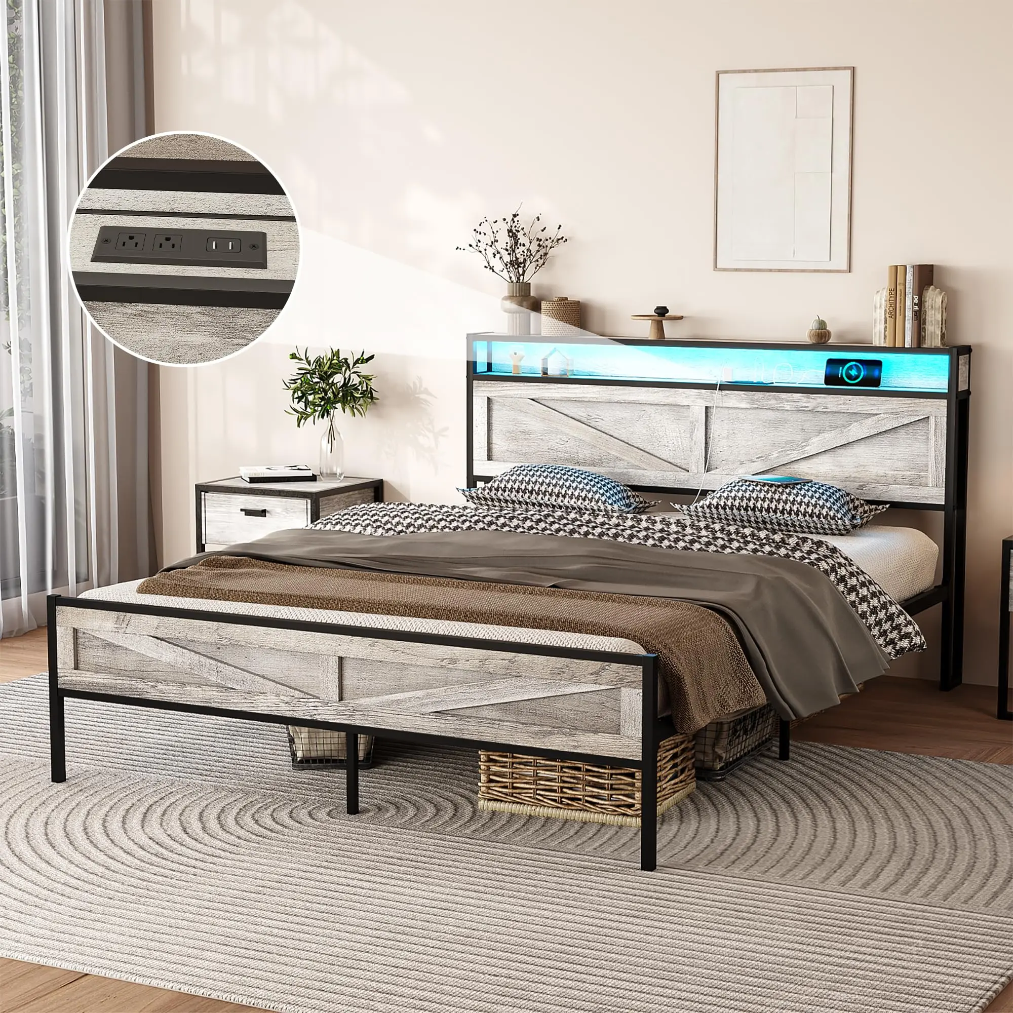 ·[ Bed Frame with Charging Station ] A charging bed frame with 2 USB ports and 2 standard sockets. Installed in the middle, it can let you charge within your reach, and can also be used to the lamp which reading, making your life more comfortable and convenient.