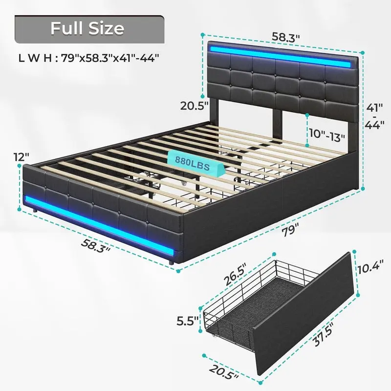 5. Sikaic 4 Storage Drawers LED Bed Frame With Leather Platform Adjustable Headboard Storage Drawers And Charging Station Black Bedroom Set Unique