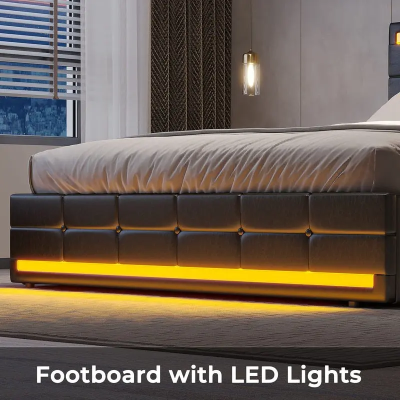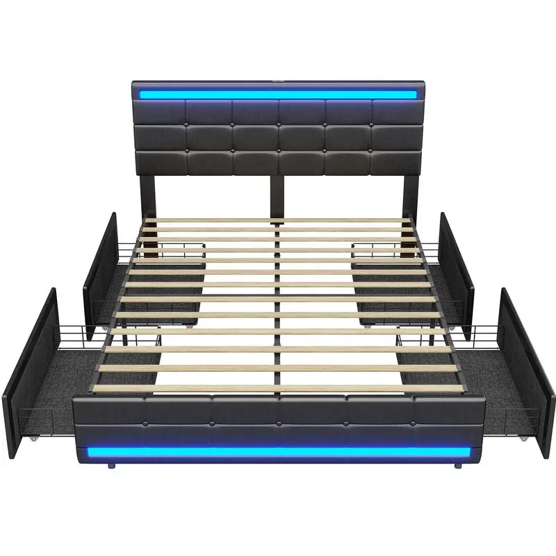 Sikaic 4 Storage Drawers LED Bed Frame With Leather Platform Adjustable Headboard Storage Drawers And Charging Station Black Bedroom Set Unique