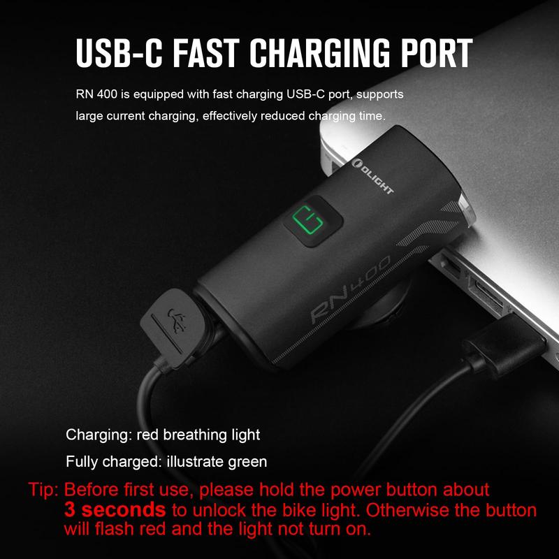 ·Rechargeable Bikelight: Olight RN 400 is a bike headlight with a max output of 400 lumens and equipped with a fast-charging USB-C port, supports large current charging, effectively reduced charging time