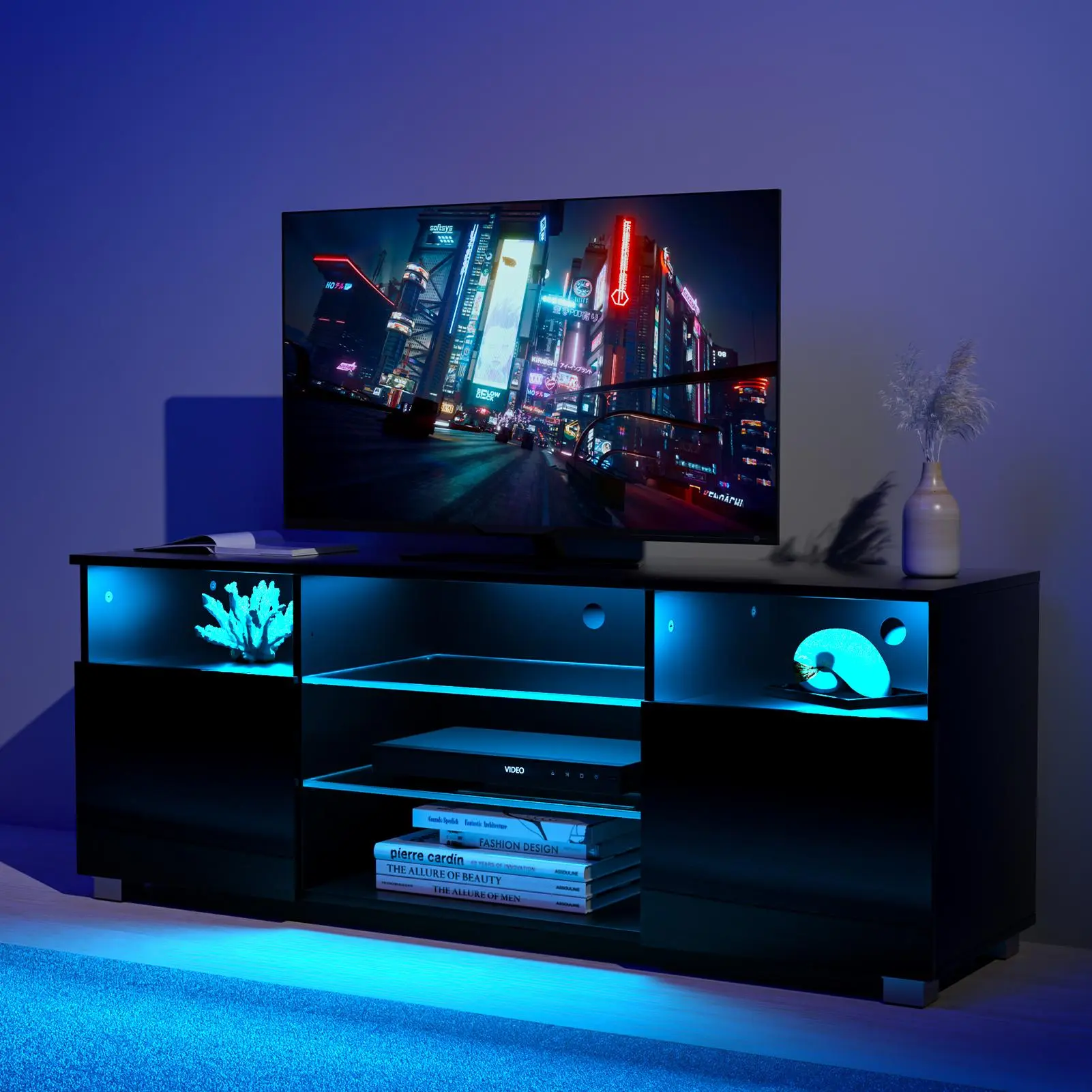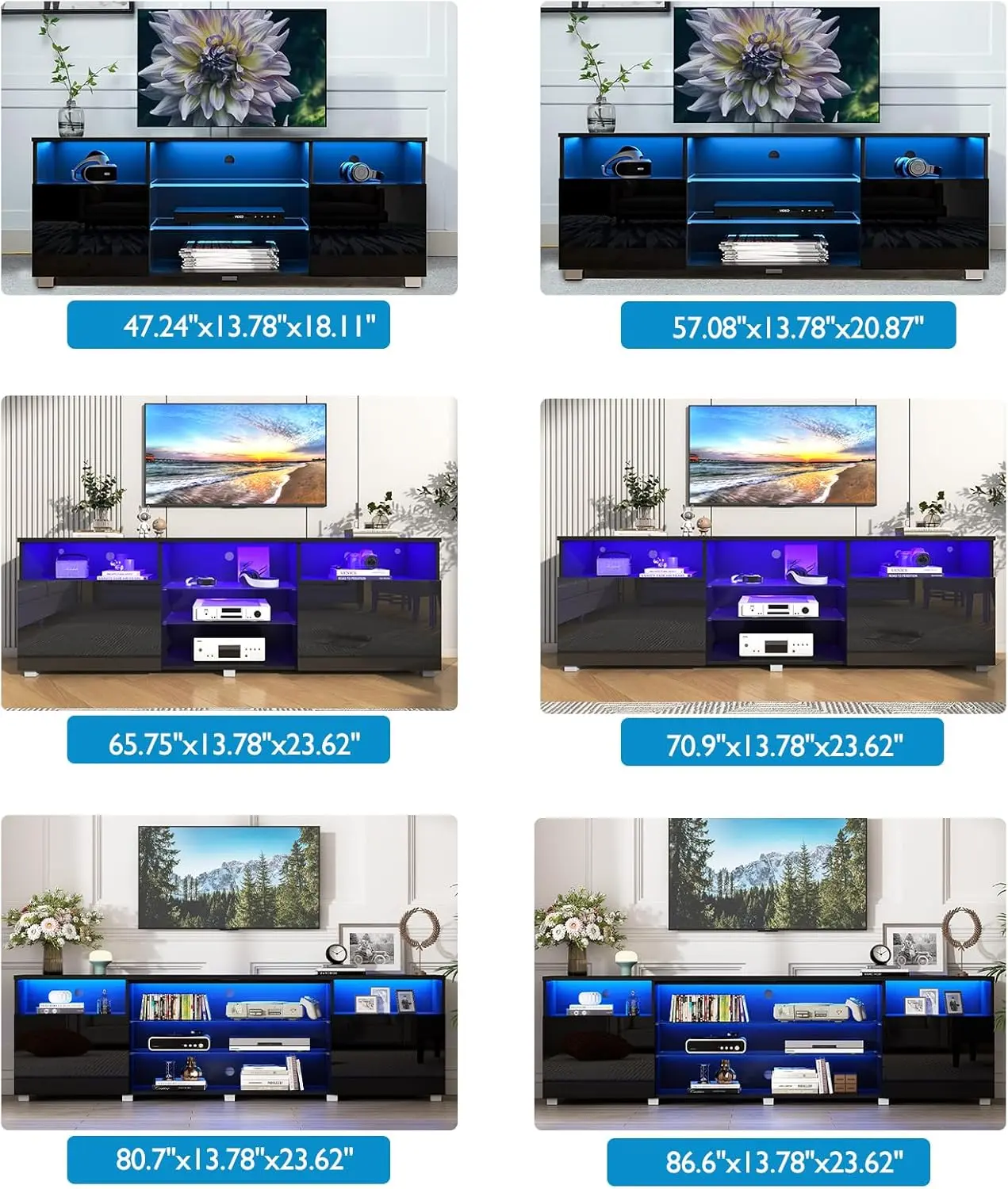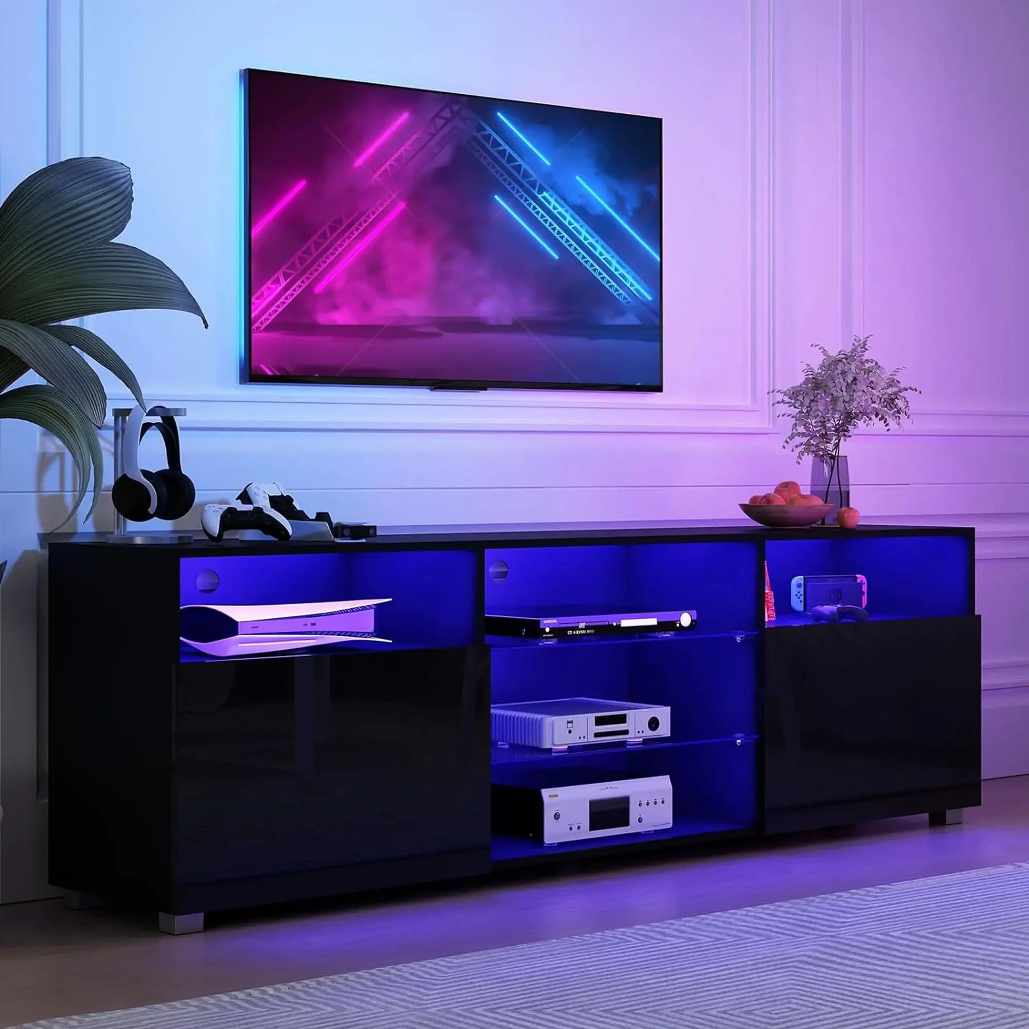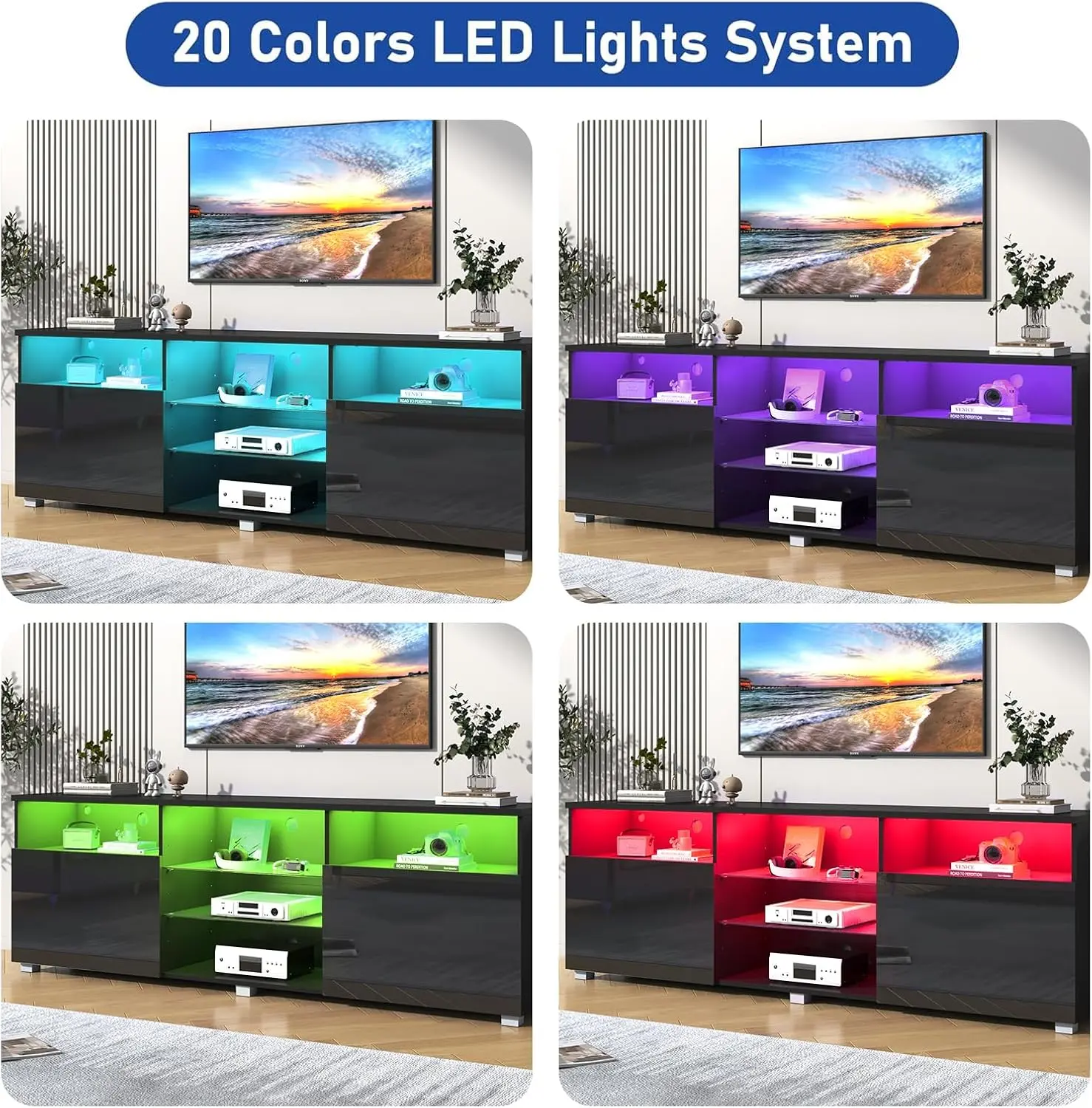 4. High Glossy and Modern Style: The cabinet doors with high glossy surface, is the perfect combination of modern and elegant. This LED entertainment center black adds special charm to your room, showing high quality minimalist home life.