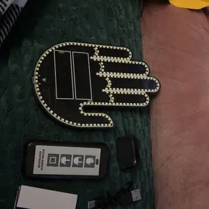 Don’t buy this product and expect to ever get it to work. It takes 3AA BATTERIES for the hand but never seen a battery the size the remote takes and it says nowhere on it