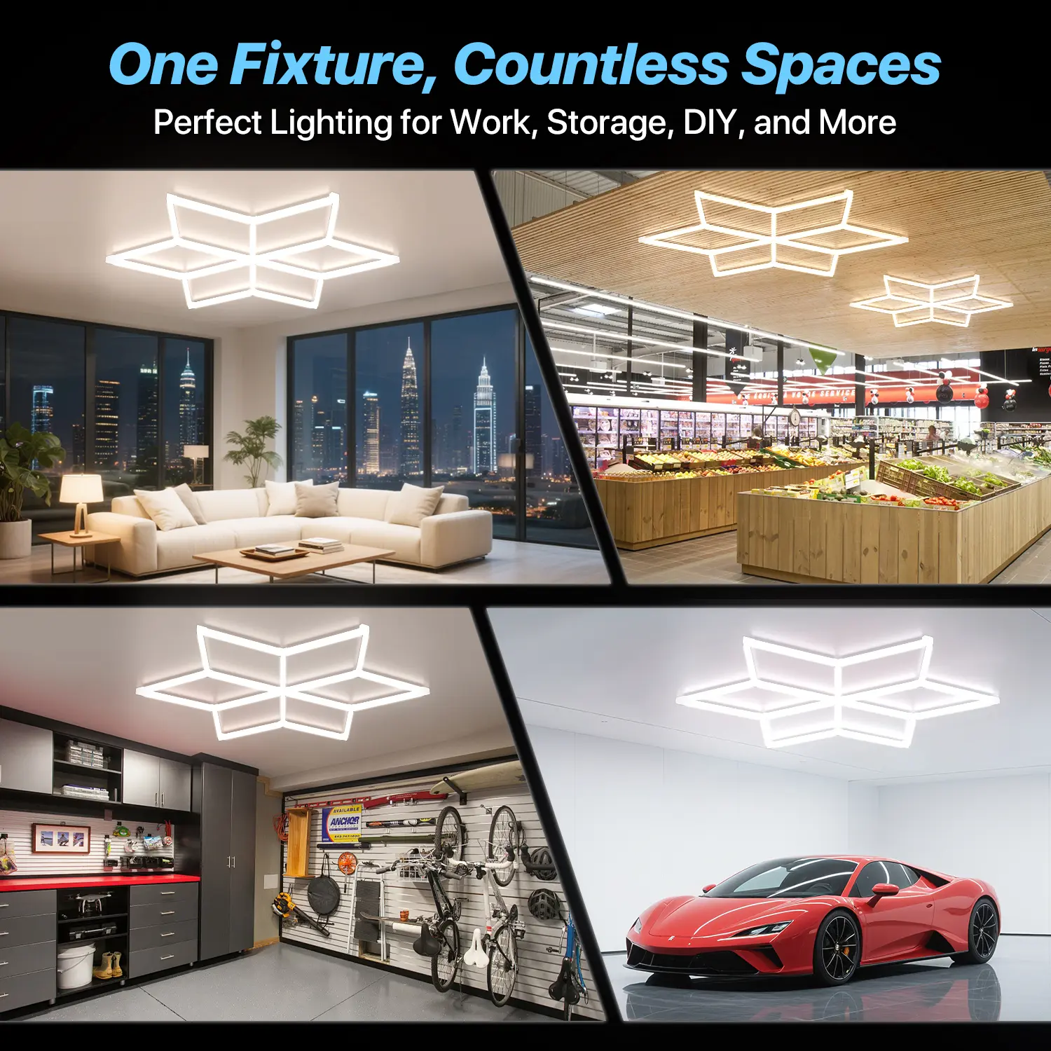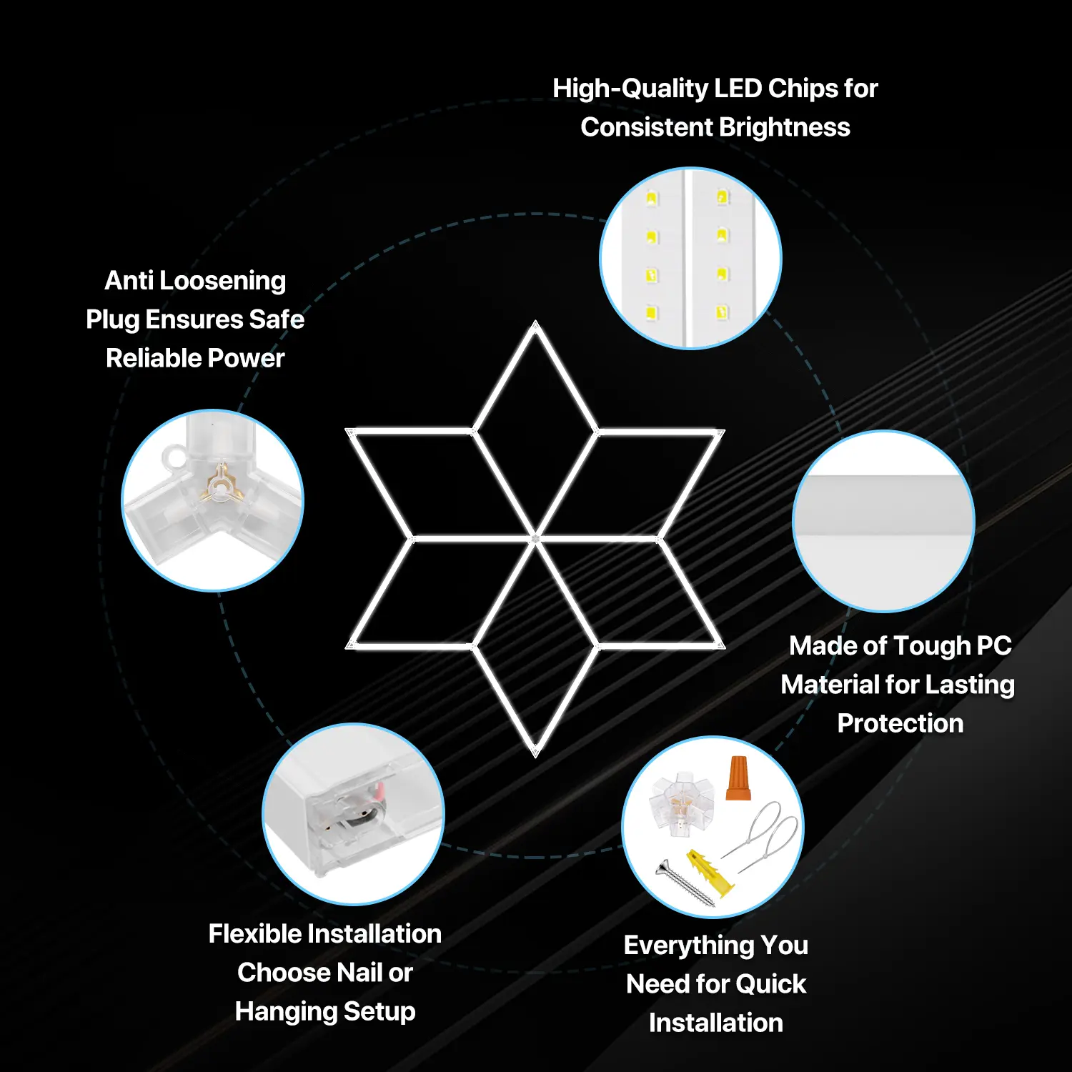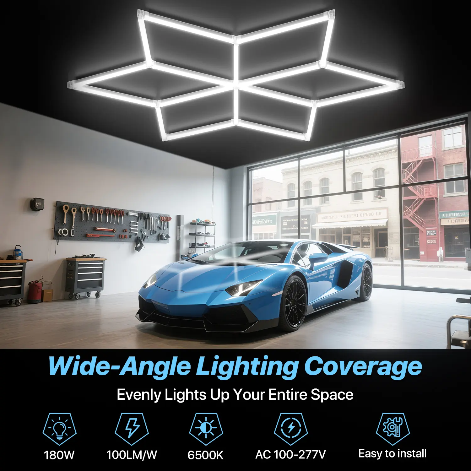 Ultra Bright Honeycomb Garage Lighting: Engineered with advanced LEDs, this hexagon light is available in multiple models, each with different wattage and lumen output, so you can choose the perfect brightness for your space. All models deliver crisp 6500K daylight for outstanding clarity and visibility, and the honeycomb design adds a sleek, modern look while providing full and even illumination.
