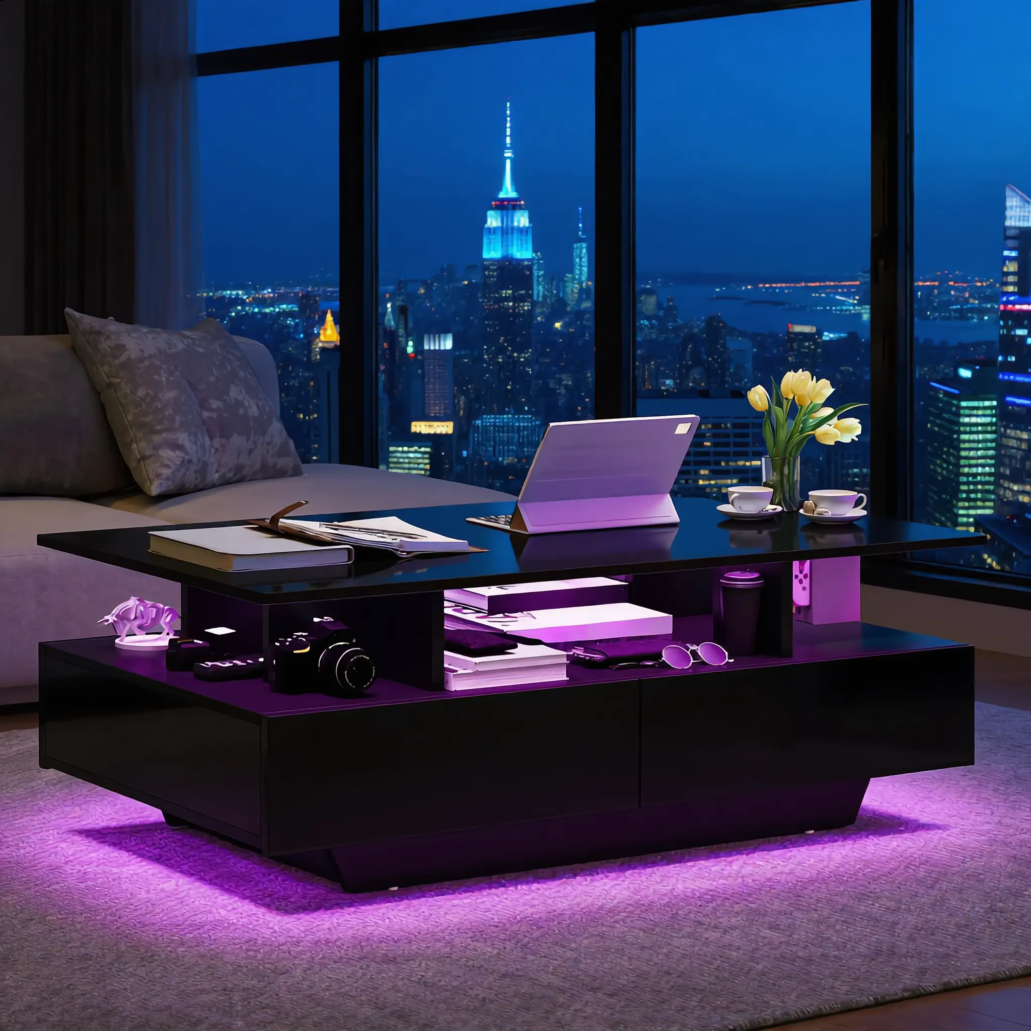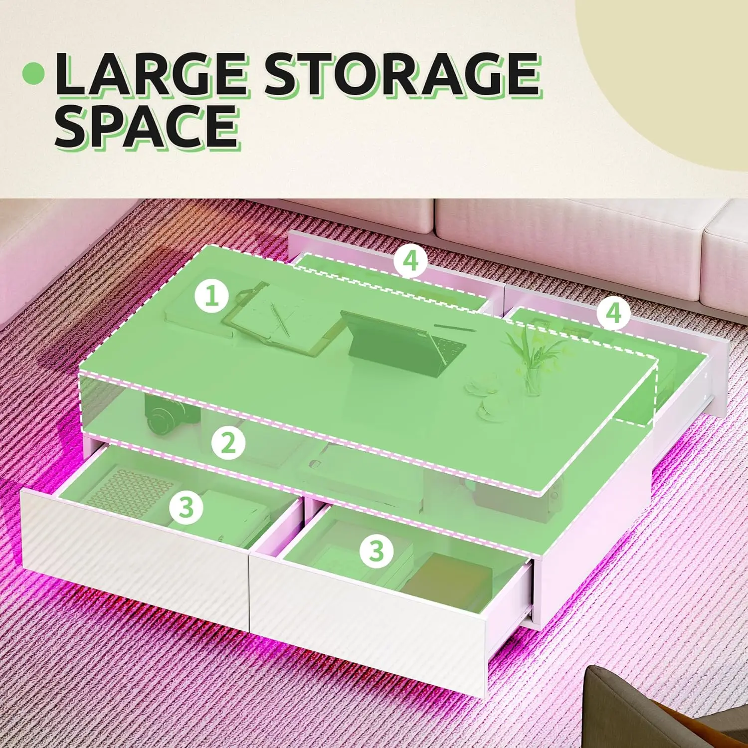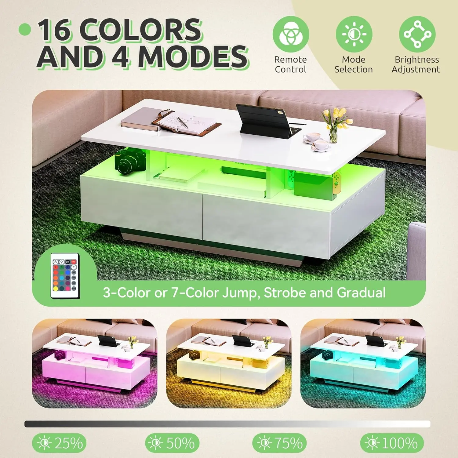 LED Coffee Tables: Set the mood by adjusting 16 captivating colors, 4 dynamic modes, and brightness via remote control of coffee table. From cozy evenings to vibrant gatherings, this modern LED coffee table has you covered