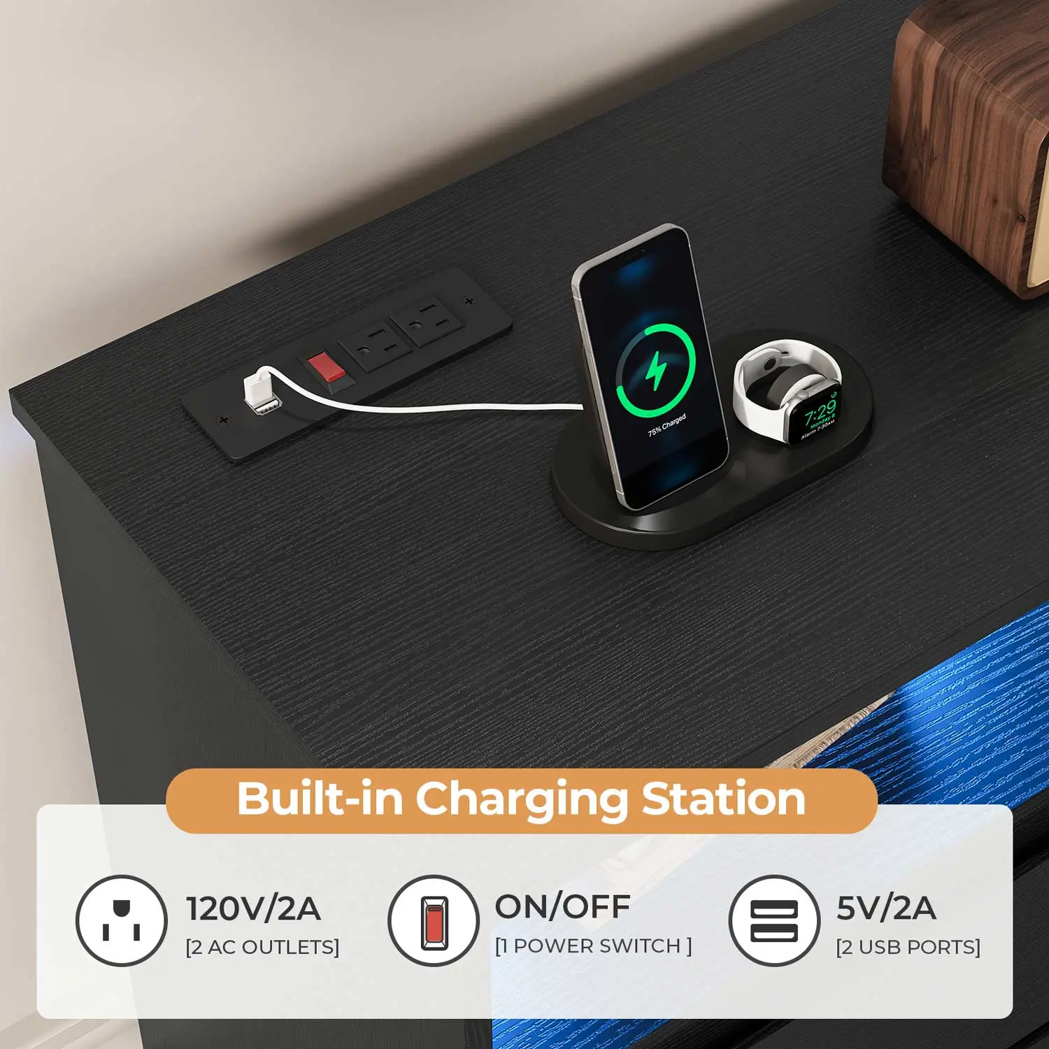 The power strip on the corner of the desktop has 2 AC outlets, 2 USB Ports, and a power switch, allowing you to charge your mobile phone and tablet, powering your desk lamp and the LED light strip of the dresser easily.