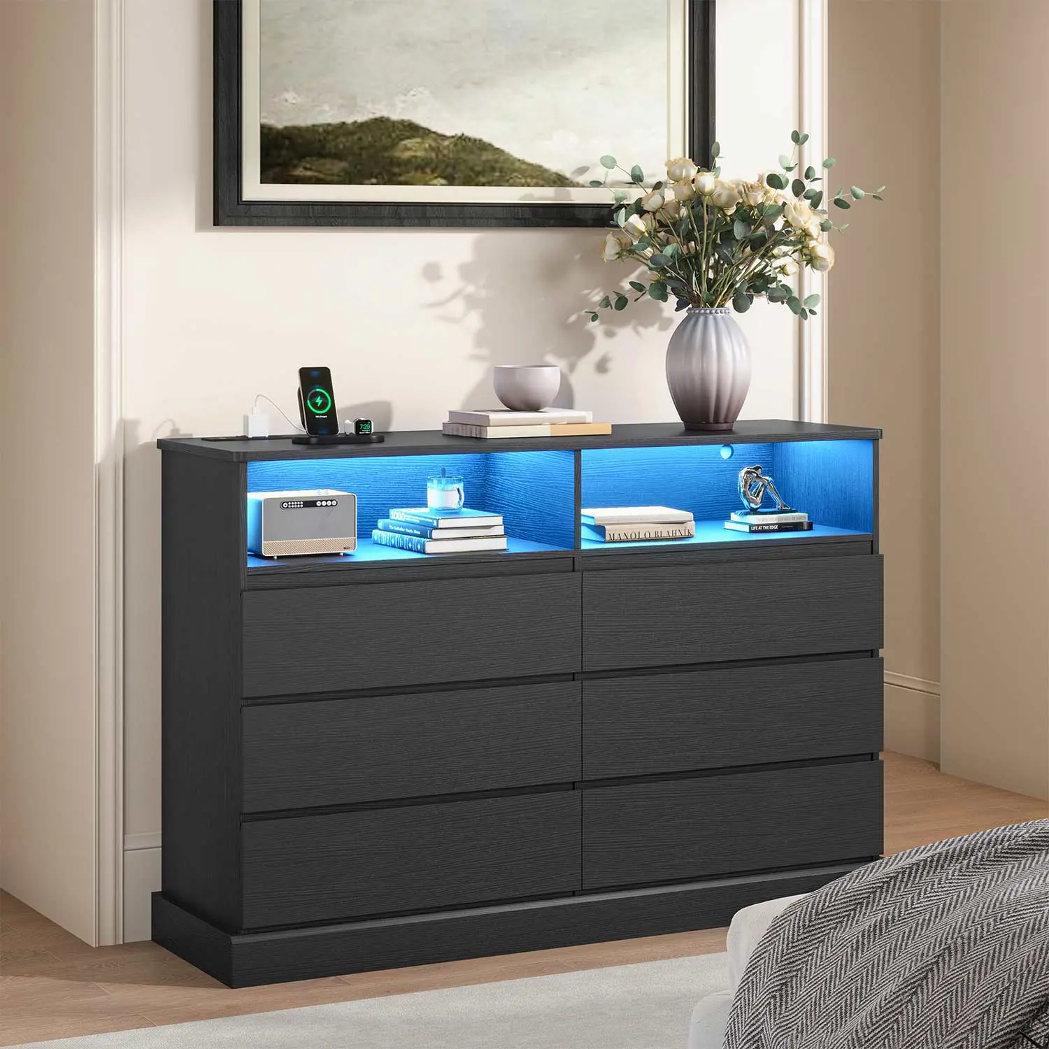 No Handle Design, 6 Storage Drawers, RGB LED Lights, 2 Open Cubbies, Charging Station