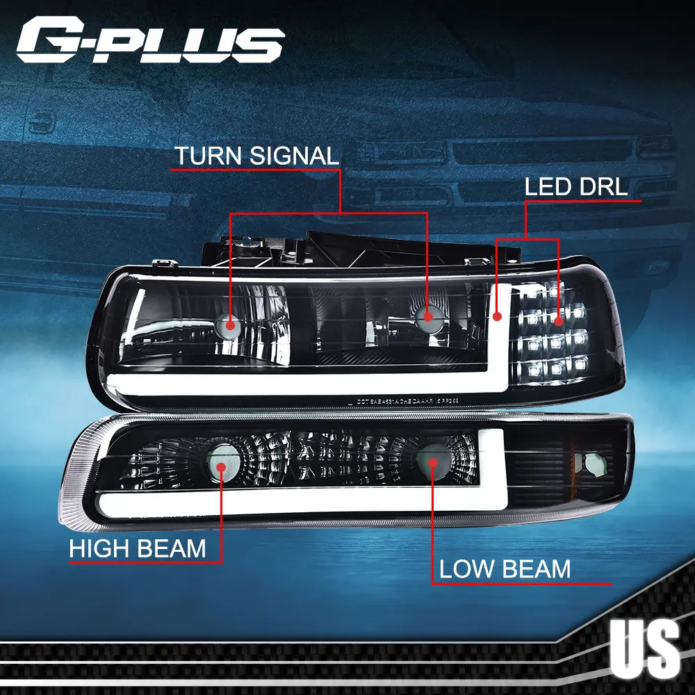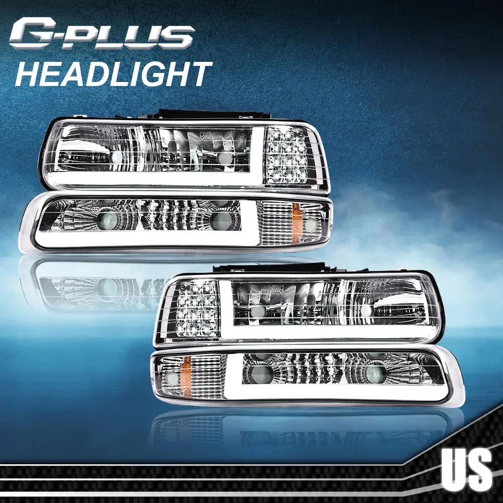 Fit For 99-02 Chevy Silverado/00-06 Tahoe LED DRL Bar Headlights & Bumper Lamps,Front LED DRL Headlights Assembly,2Pcs Black (Left+Right)