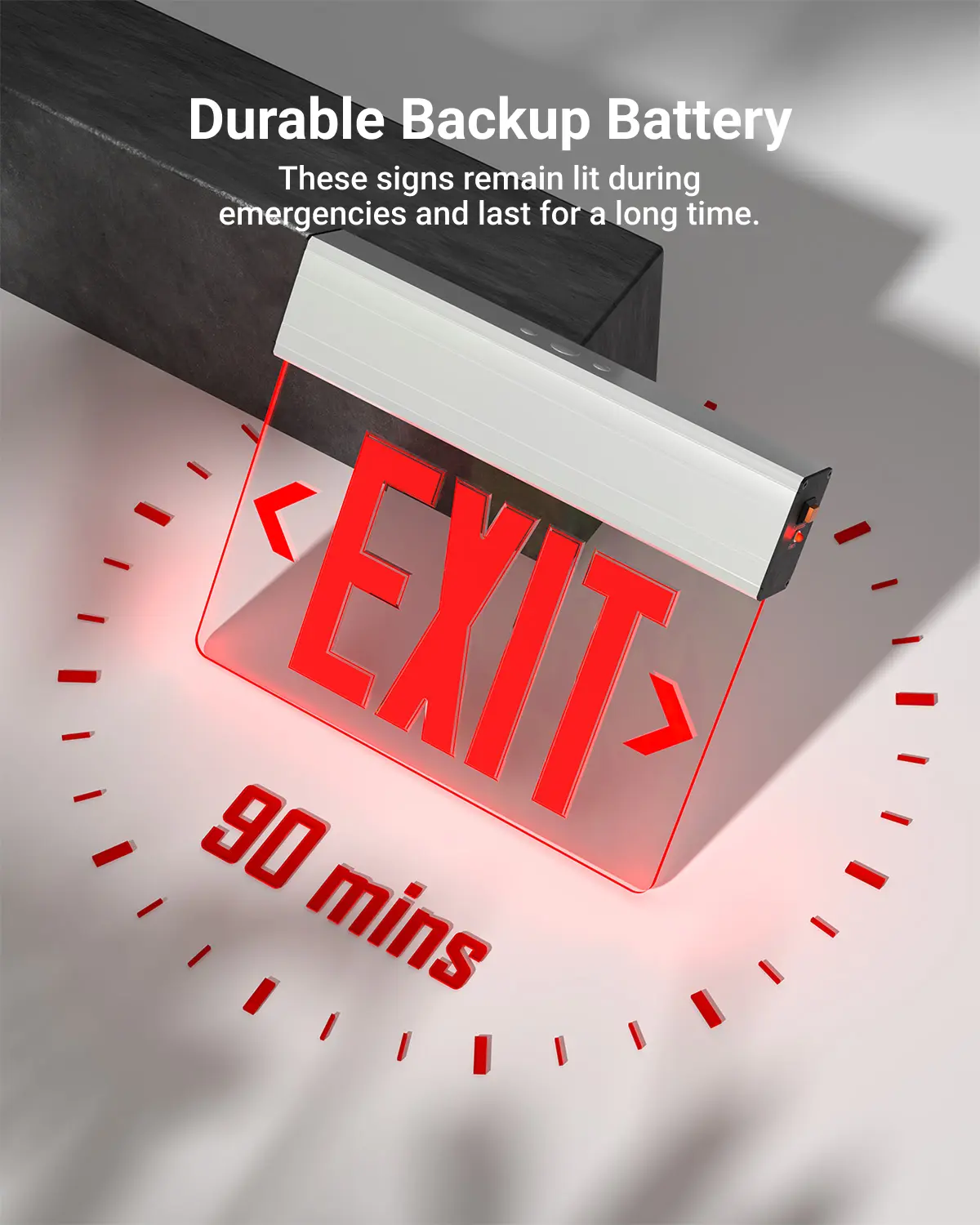 Clear acrylic red exit sign. Lights stays on for 90 min during power outage for safety lighting