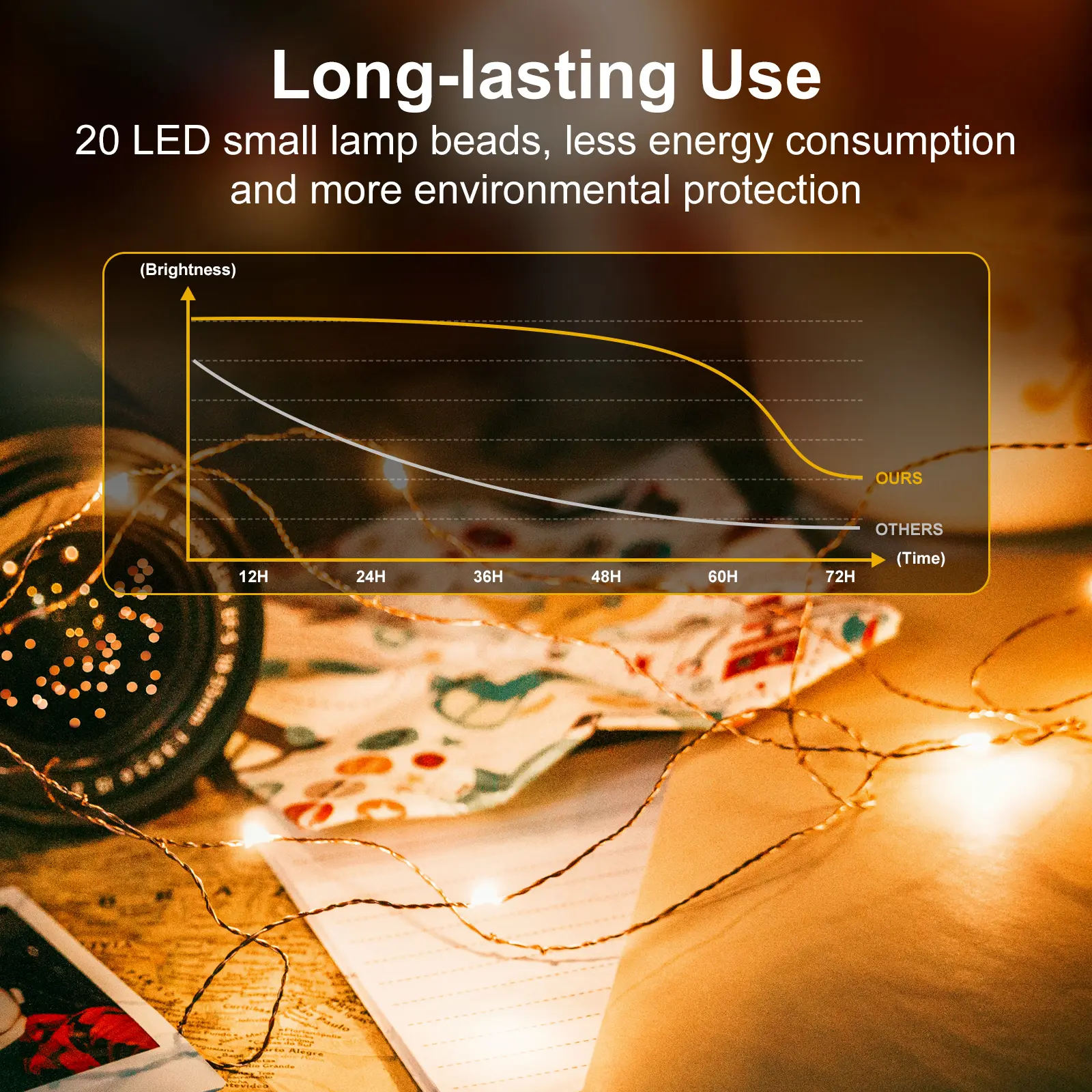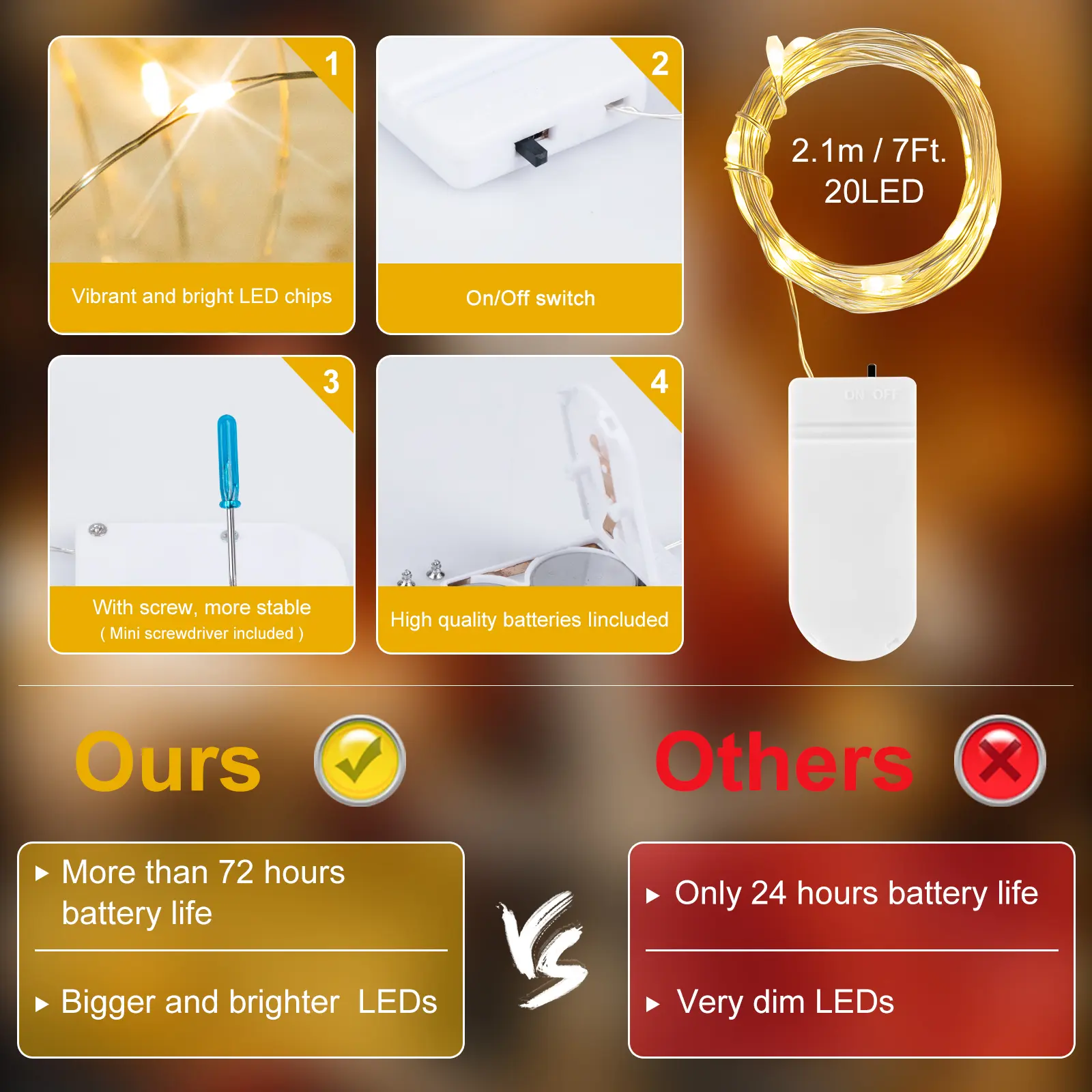·【 12 Pack Battery Operated LED Fairy Lights 】- Powered by 2 CR2032 batteries (included), the 7 feet micro fairy light with 20 upgraded energy-efficient LEDs is perfect for both everyday decorations as well as holiday decor. The thin copper wiring and small-sized LED bulbs will add a delicate and cozy touch to your personal space