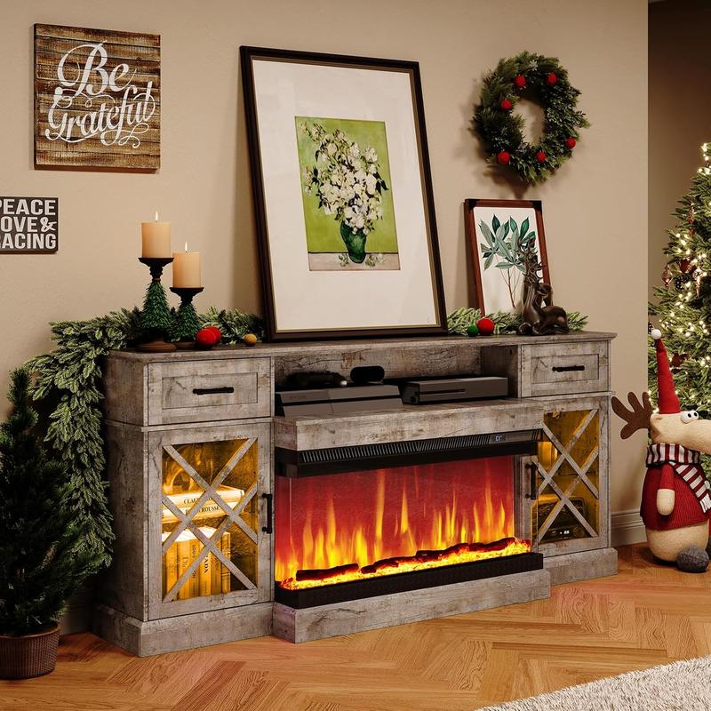 ·FITS TVS 80'' - AMERLIFE 70'' large entertainment center can accommodate TVs up to 80'', including a 36'' fireplace. TV Stand Dimensions: 70 W x 15.35 D x 32 H in; Fireplace Dimensions: 36 W x 7.8 D x 17 H in.