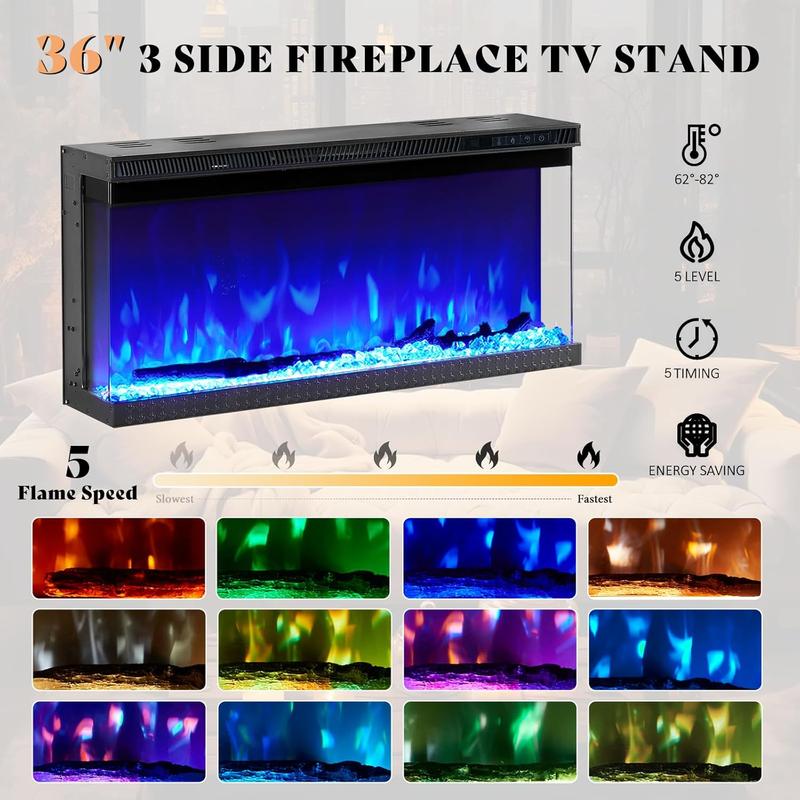 ·3-SIDE LED TV STAND - Panorama fireplace enables you to enjoy 12 realistic flame colors and 5 levels of adjustable dimming, from any seat in the room. Even on the sides, you can appreciate the vivid flames. Customize your entertainment time with 12 different flame colors.