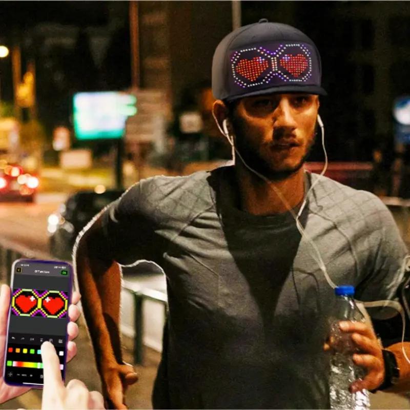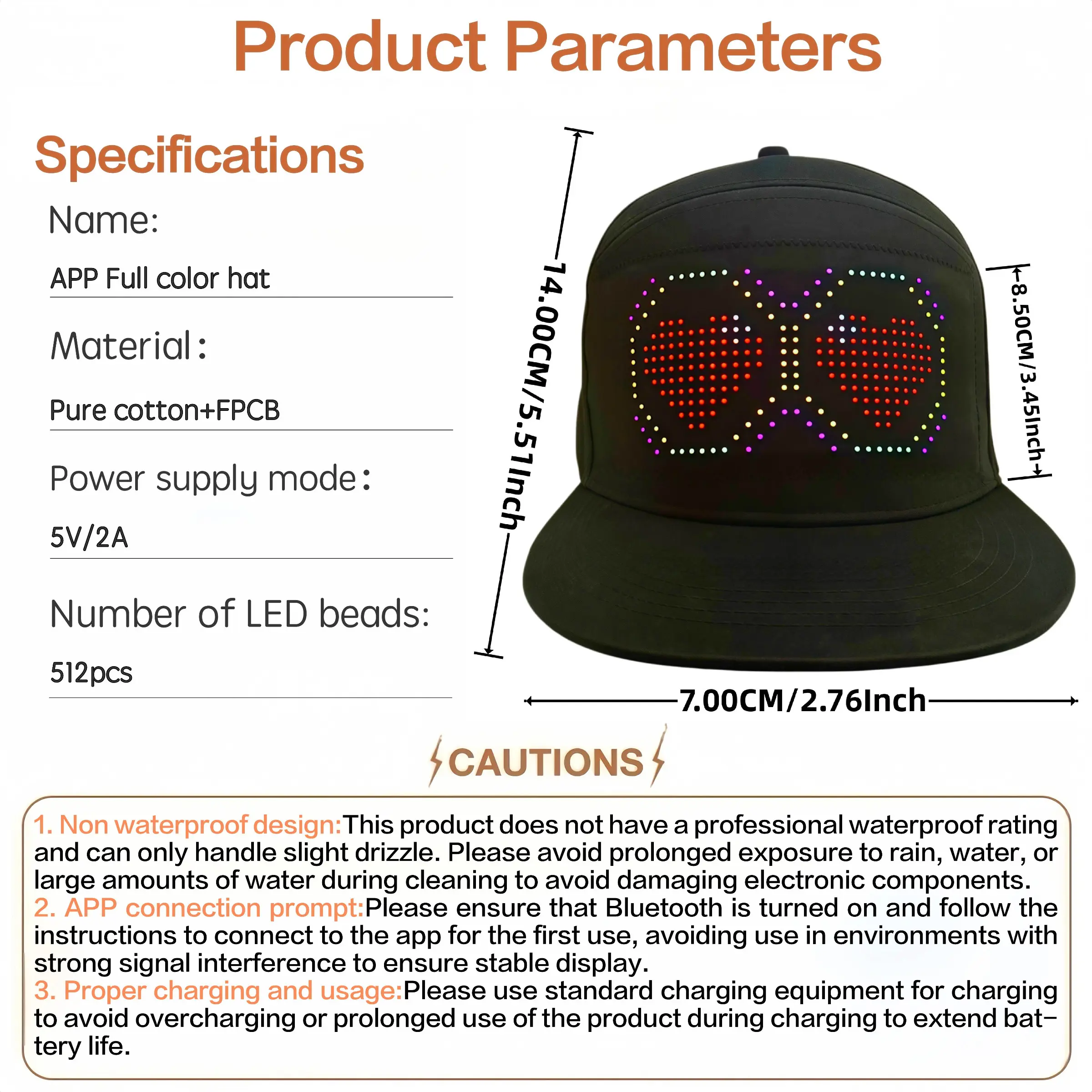 【High resolution LED display | Clear and colorful picture】Adopting high-density miniature LED beads and an extended flexible display screen, it can display more characters and dynamic graphics, presenting clear and vivid visual effects. It is an eye-catching full-color LED cap and electronic display cap.
