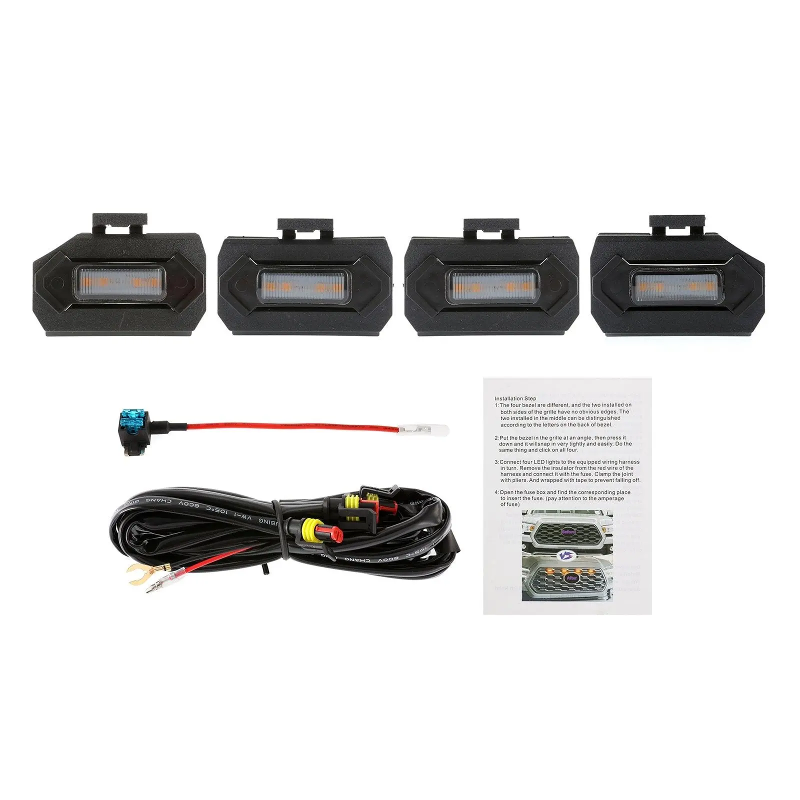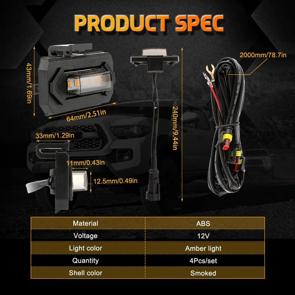 ✨ Product Overview:This set includes 4 LED front grille lights for Toyota Tacoma 2020-2021 TRD Off Road/TRD Sport. Made of ABS plastic, these lights prevent scratches, water, and corrosion. They come with a harness and fuse adapter for extended lifespan. The smoked shell color adds a stylish touch.